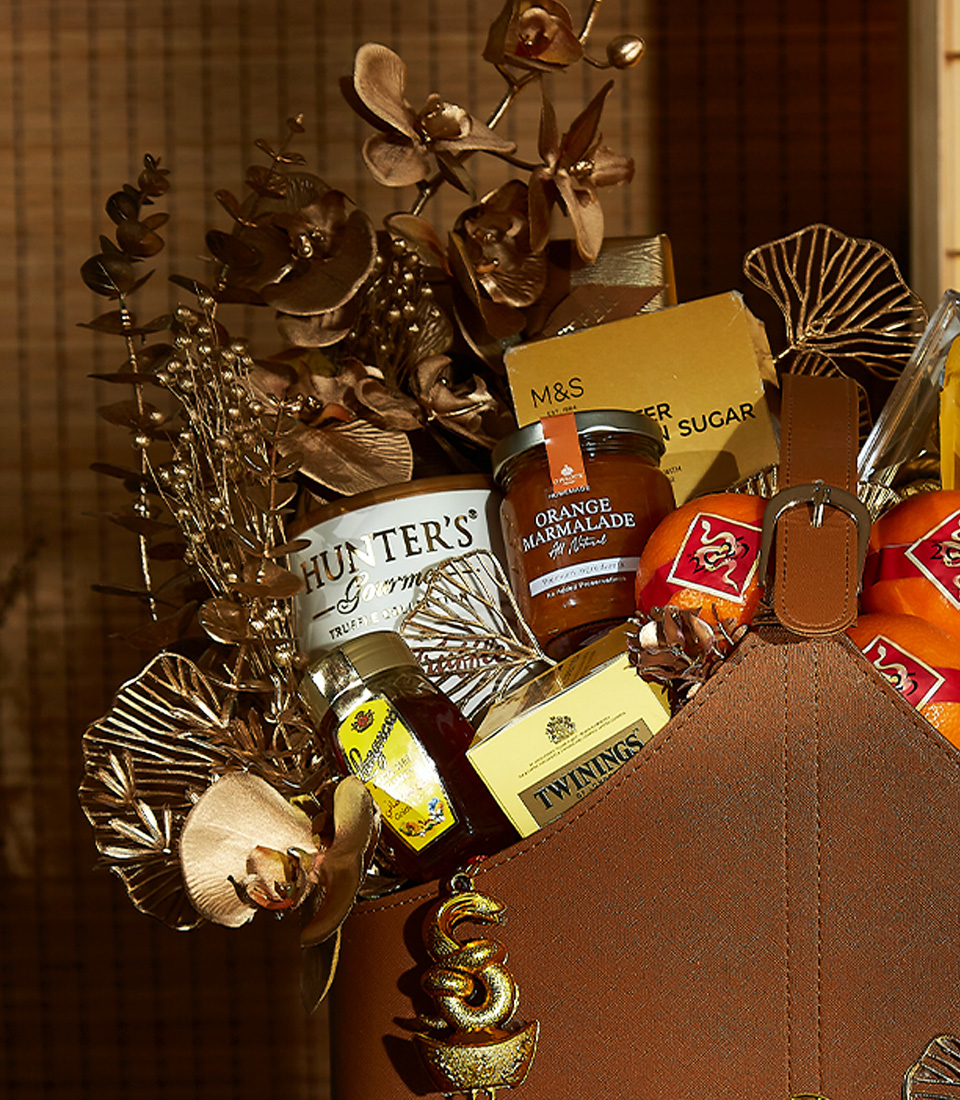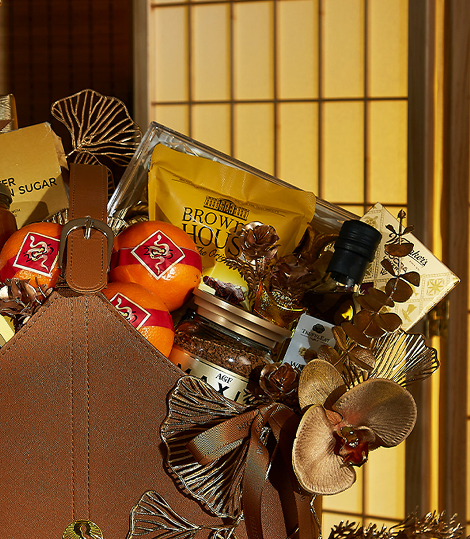 Luxury Blessings Chinese New Year Basket Celebrate the Lunar New Year in style with the Golden Elegance Hamper. This luxurious gift includes premium mandarins, gourmet treats, and festive decorations, all presented in a golden leather basket. A sophisticated gift for loved ones or corporate celebrations.