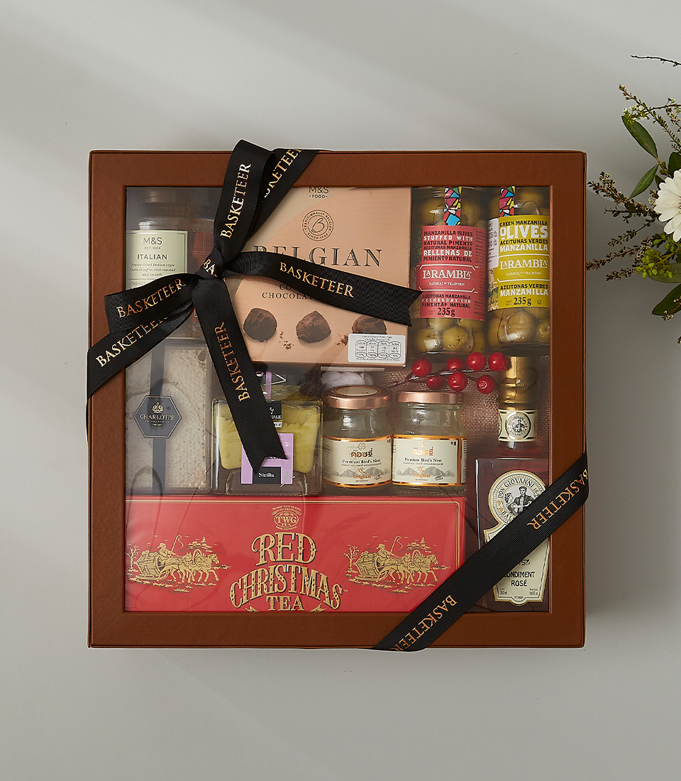 Celebrate the season with a luxurious hamper featuring Red Christmas Tea, Belgian truffles, olives, and gourmet honey. A perfect festive gift.