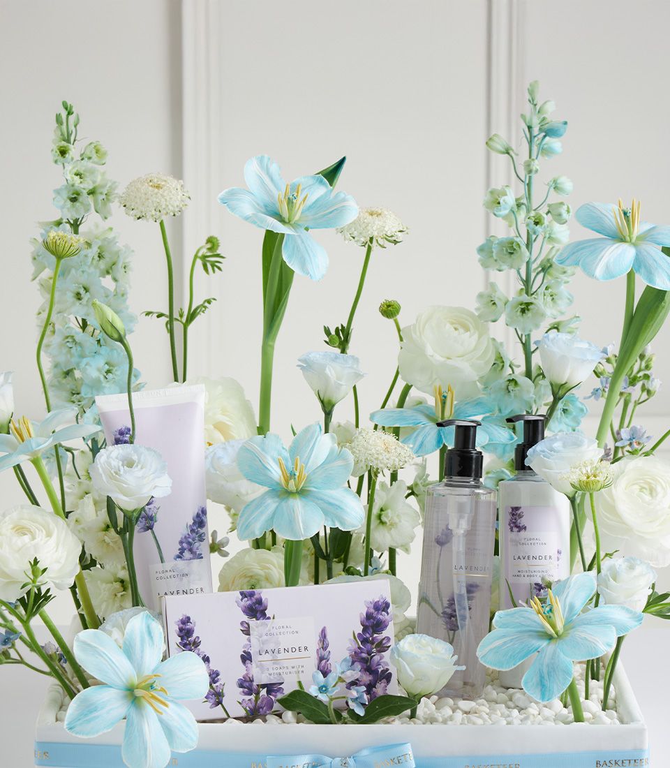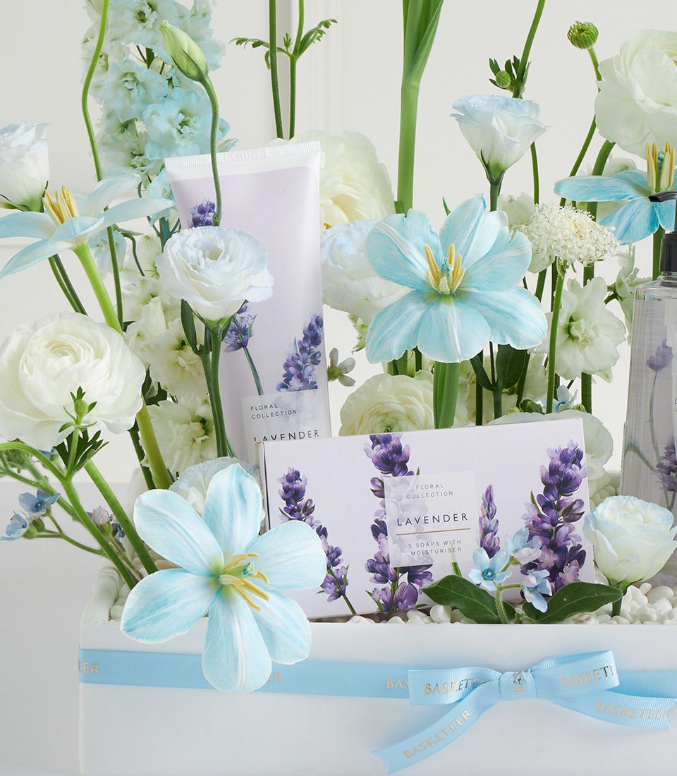 Luxury Lavender Mother’s Day Spa Basket Delight mum with this luxury lavender spa gift basket, featuring M&S bath and body treats paired with fresh light blue blooms. Perfect for creating a relaxing, fragrant, and memorable Mother’s Day surprise.