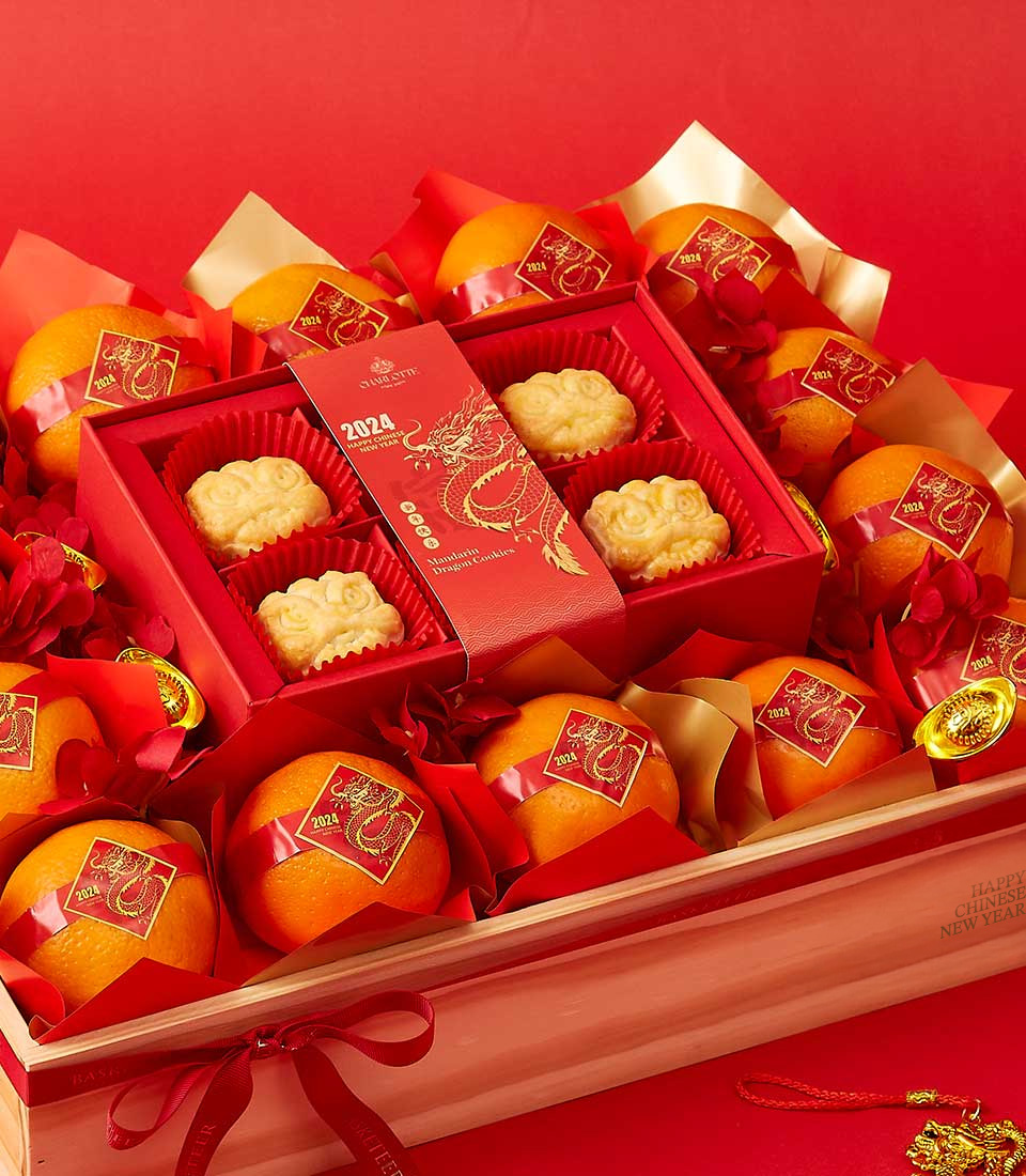 Celebrate Chinese New Year with our gift set featuring vibrant oranges, festive pastries, and lucky gold accents in a premium wooden box.
