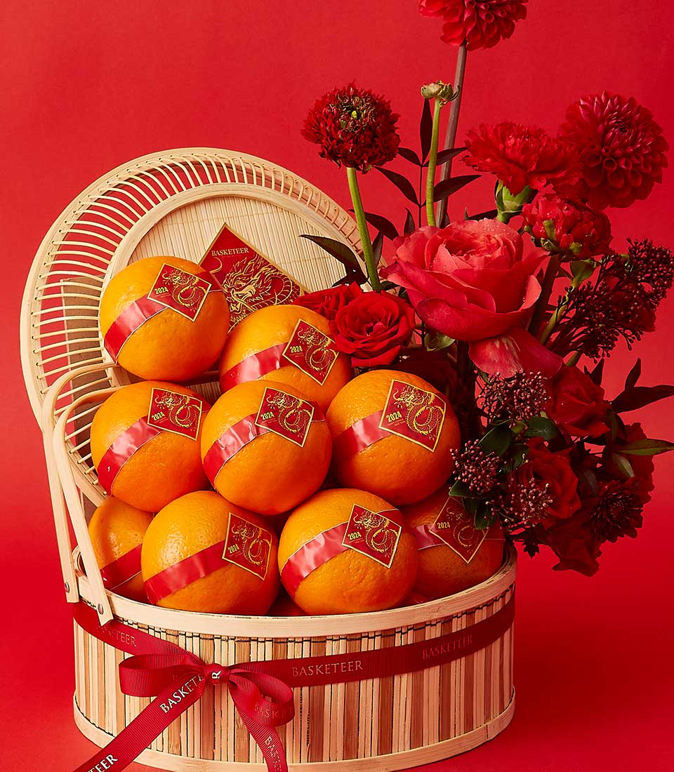 Welcome luck and beauty this Lunar New Year with the Prosperity Citrus Basket featuring premium oranges and vibrant red floral accents.