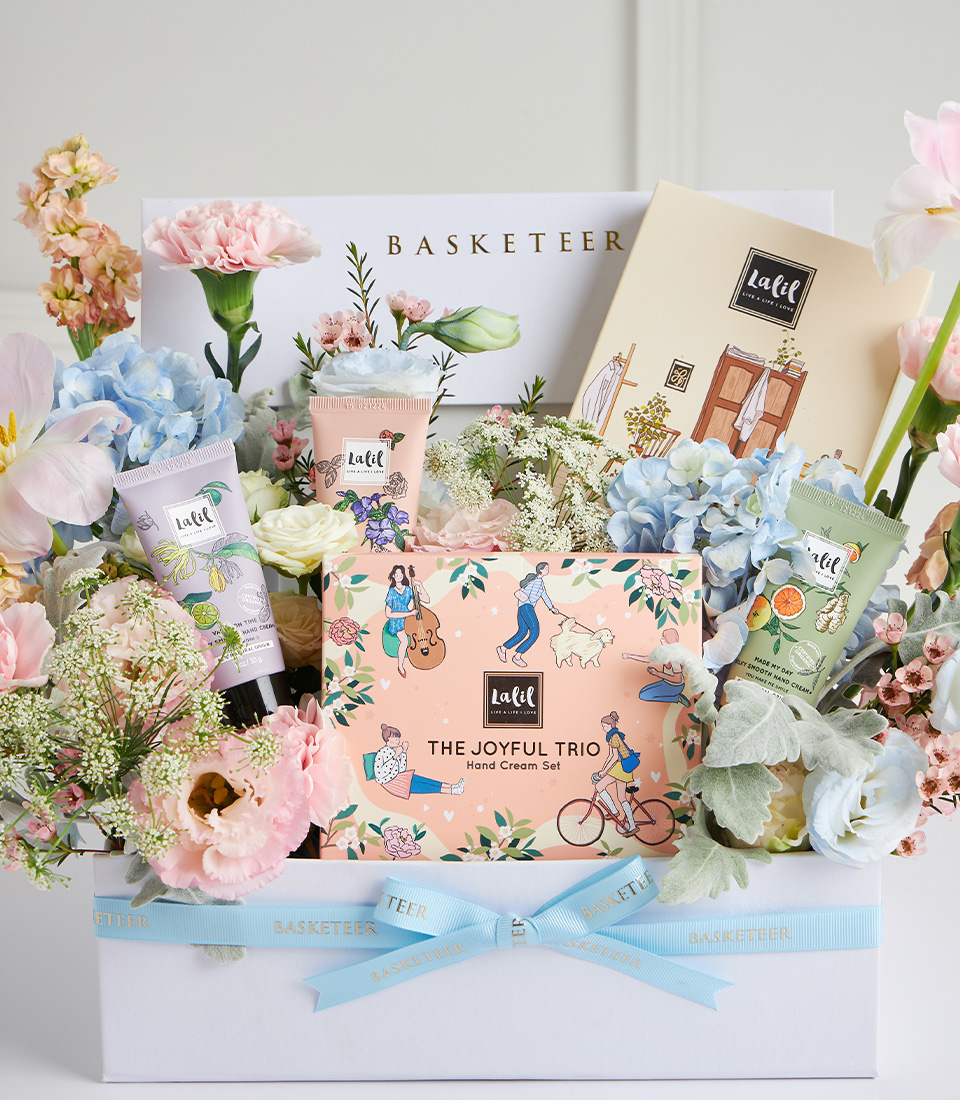 Elegant pastel floral gift box with Lait hand cream set, carnations, and hydrangeas. Perfect for beauty lovers and special occasion gifting.