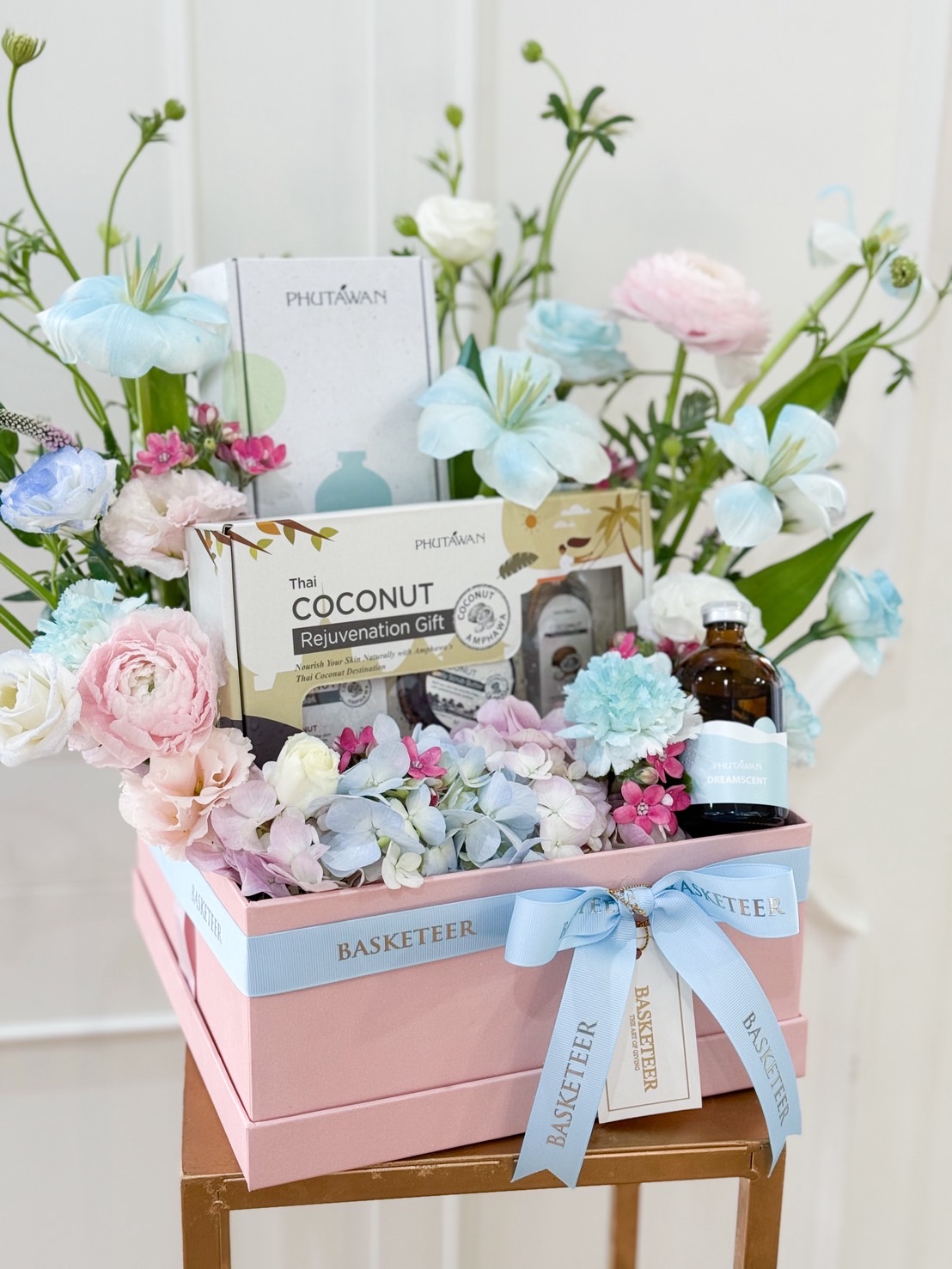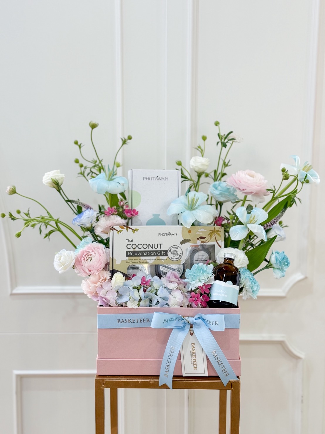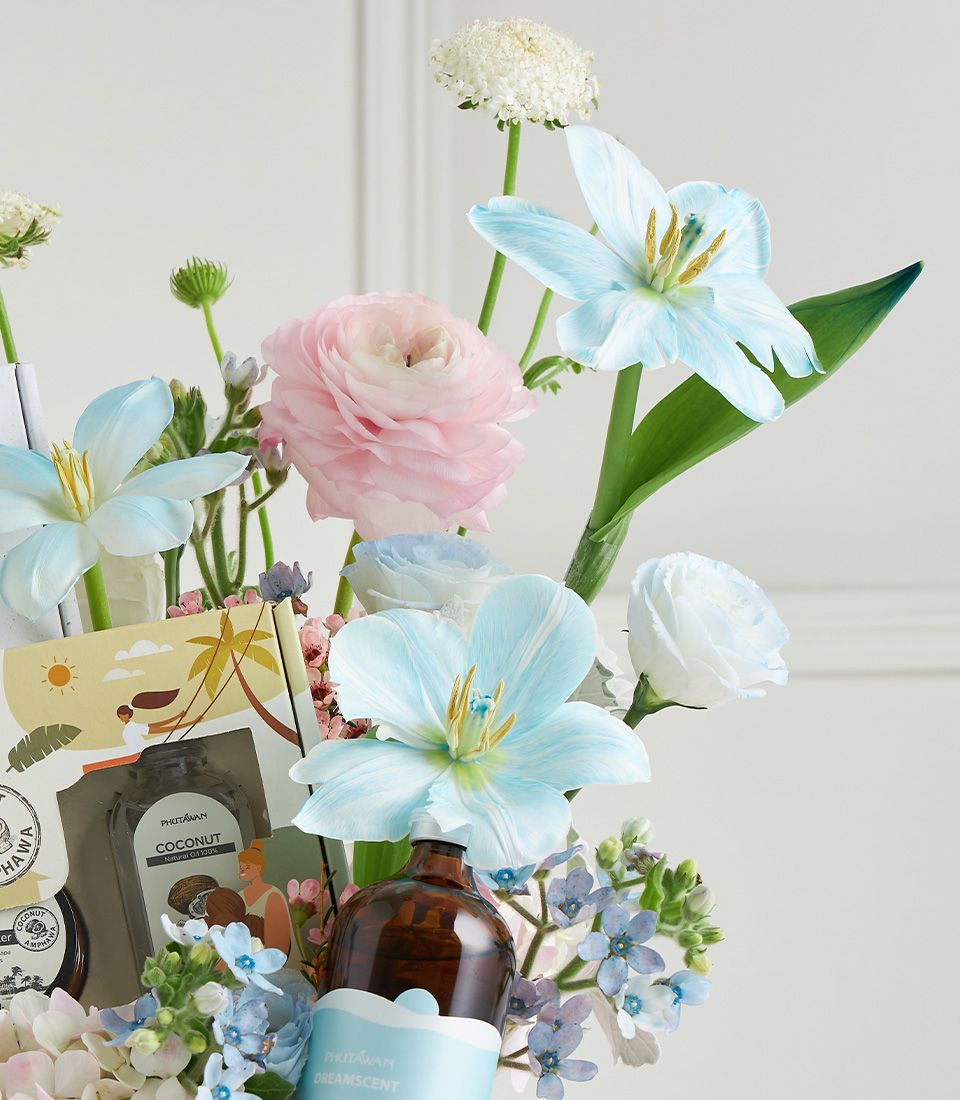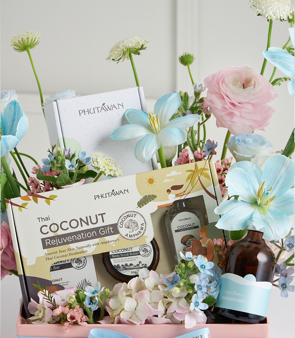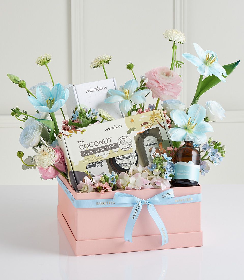 Mother’s Day Pastel Spa Gift Box Delight mum with this luxury pastel spa gift box, featuring Phutawan coconut rejuvenation set, aroma oil, and skincare treats, adorned with soft blooms in blue, pink, and white. A thoughtful gift of relaxation, beauty, and love.