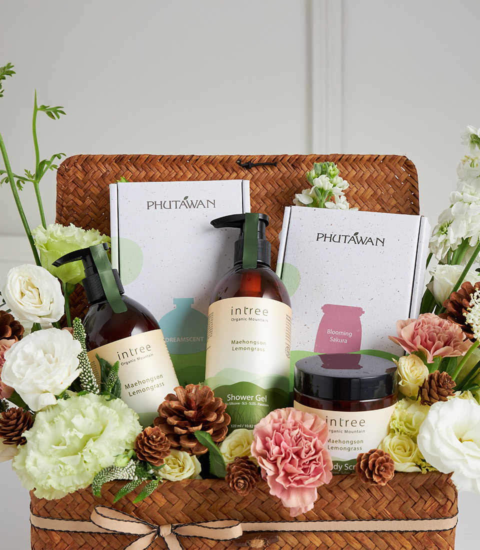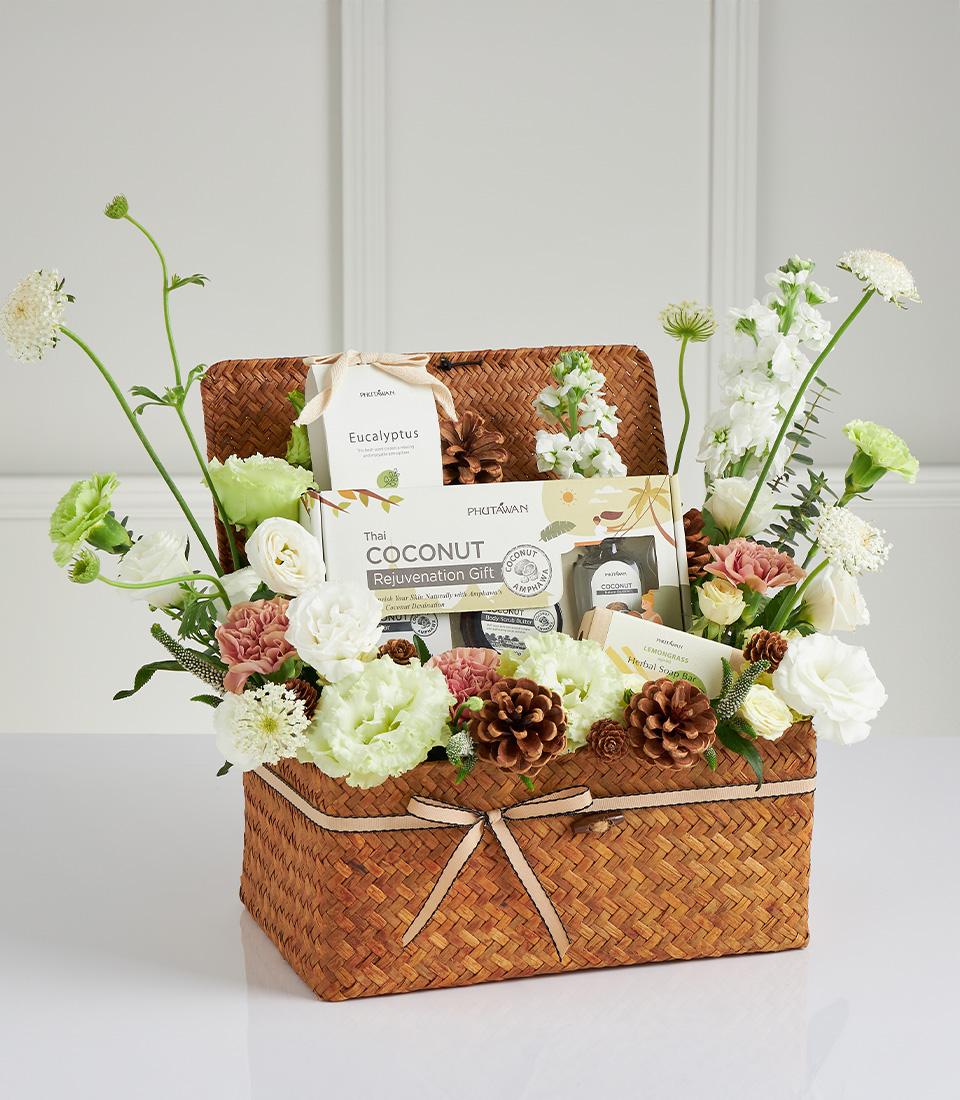 Luxury coconut spa gift box with fresh flowers and pinecones. Perfect for wellness lovers and special occasion gifting.