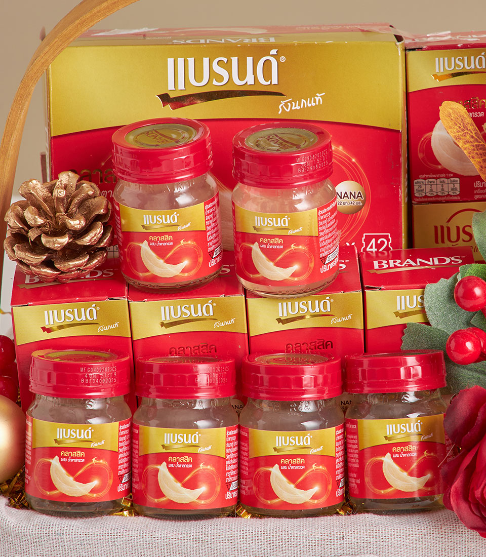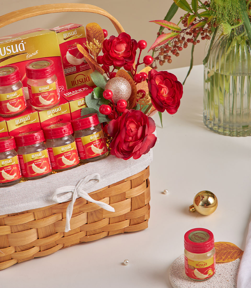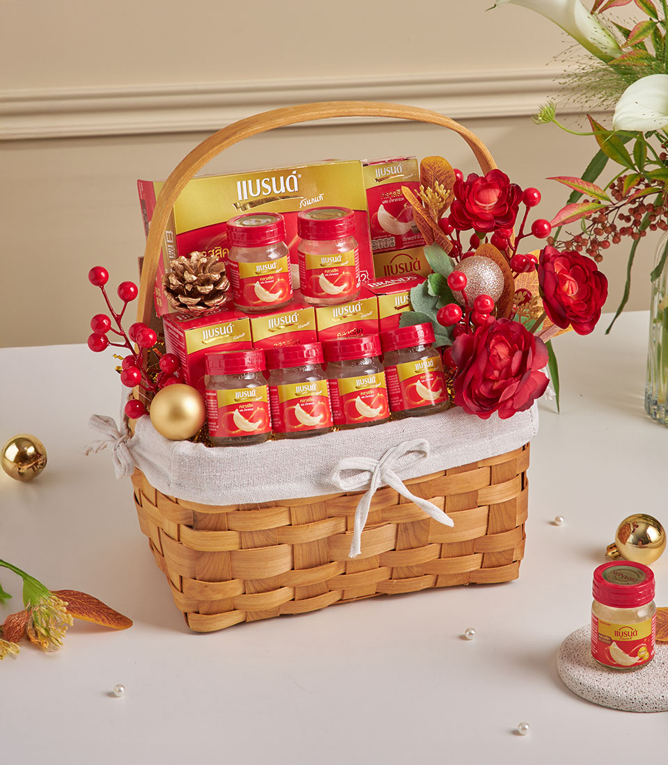 Warm wicker basket presenting Brand Bird’s Nest Classic bottles in festive red tones, ideal for premium well‑wishes and respectful gifting.