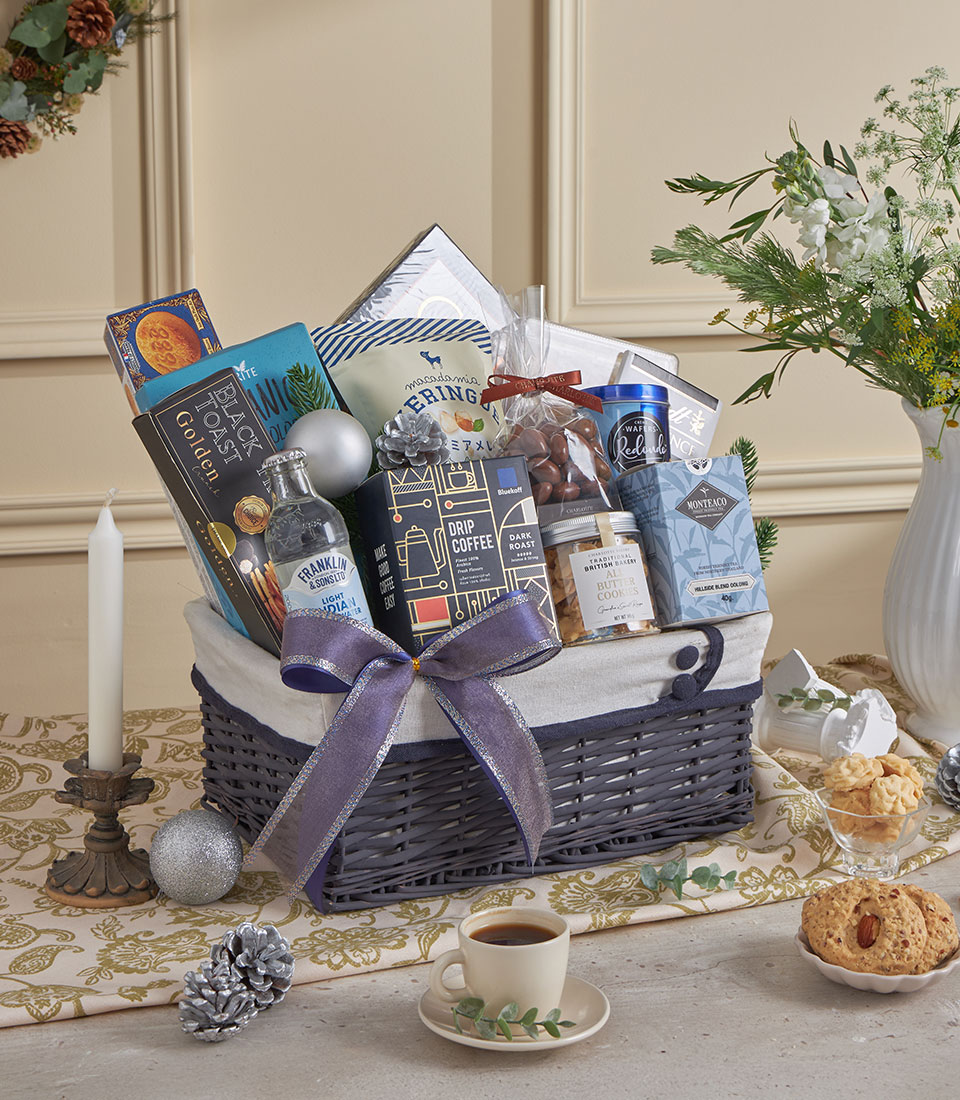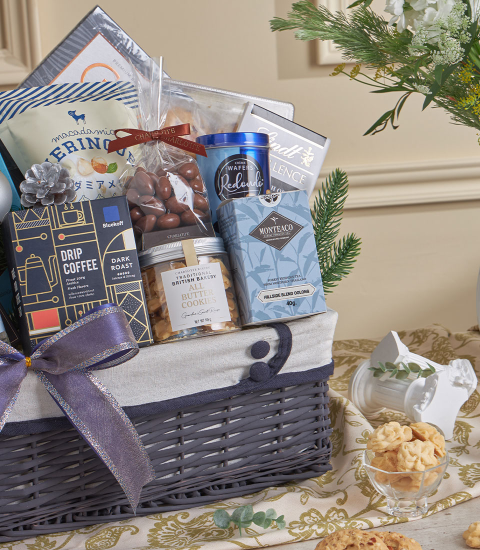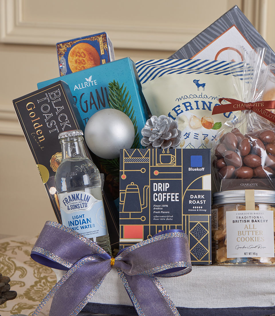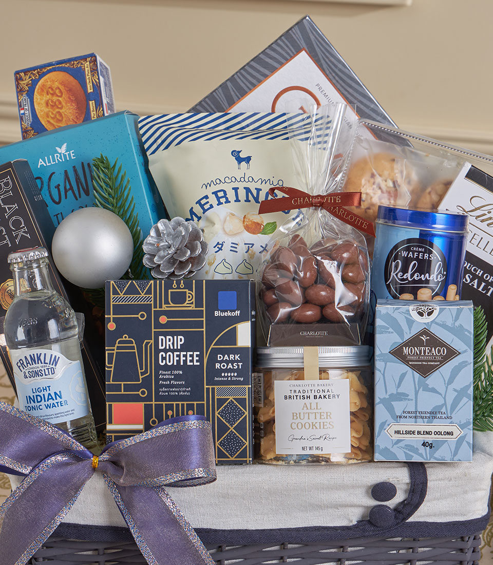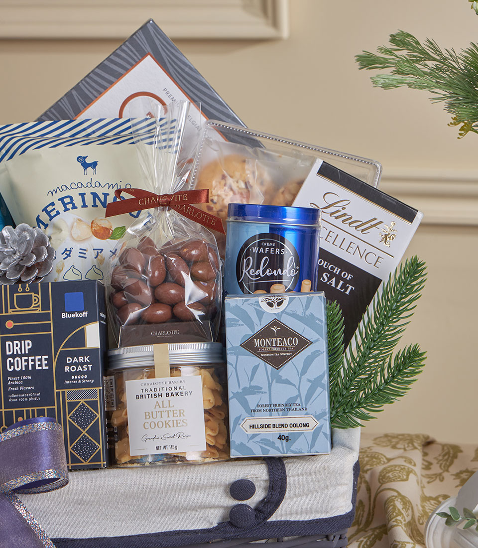 Silver Gourmet Coffee & Chocolate Delight Hamper A refined silver-grey gourmet hamper curated with premium chocolates, artisan cookies, aromatic coffee, fine tea, gourmet pasta and crisp wafers. Finished with Basketeer’s elegant grey ribbon, this sophisticated set is perfect for festive gifting, corporate appreciation and New Year celebrations in Bangkok.