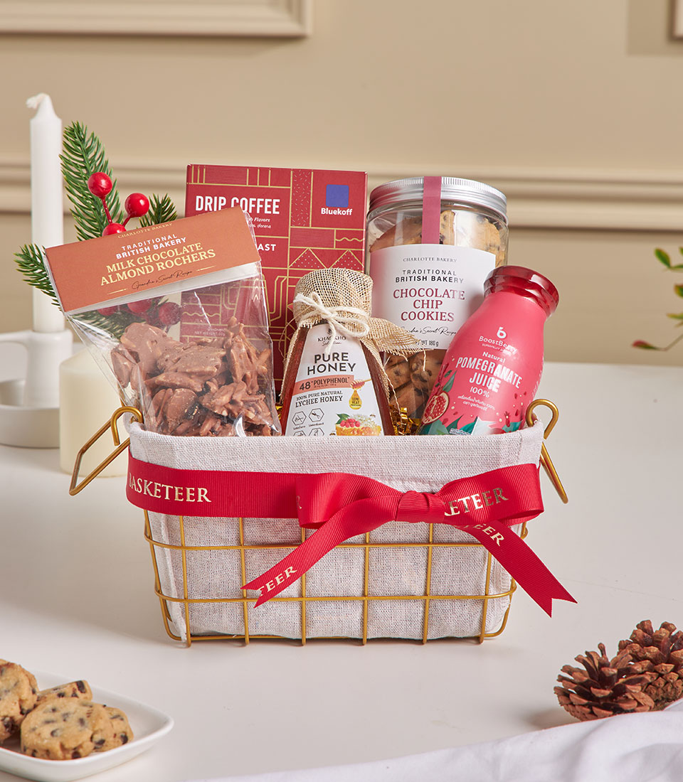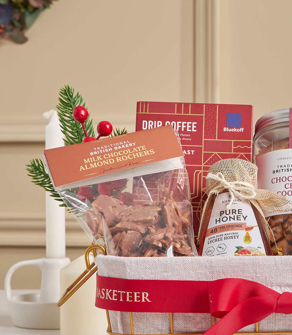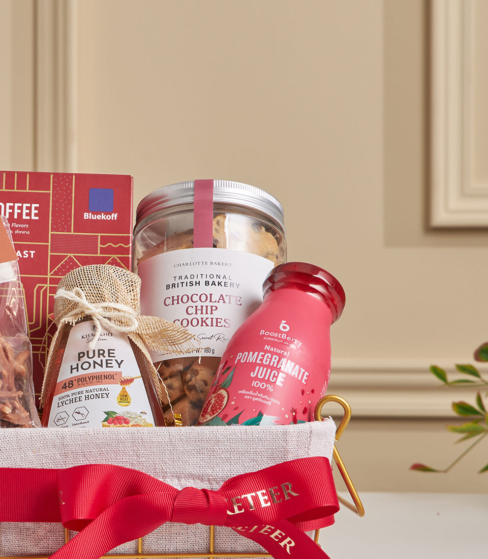 A sweet and thoughtful mini gourmet basket featuring Bluekoff medium roast coffee, Charlotte chocolate chip cookies, Charlotte milk chocolate almond rochers, pure lychee honey, and 100% natural pomegranate juice. Perfect for small celebrations, appreciation gifts, and warm gestures delivered across Bangkok.
