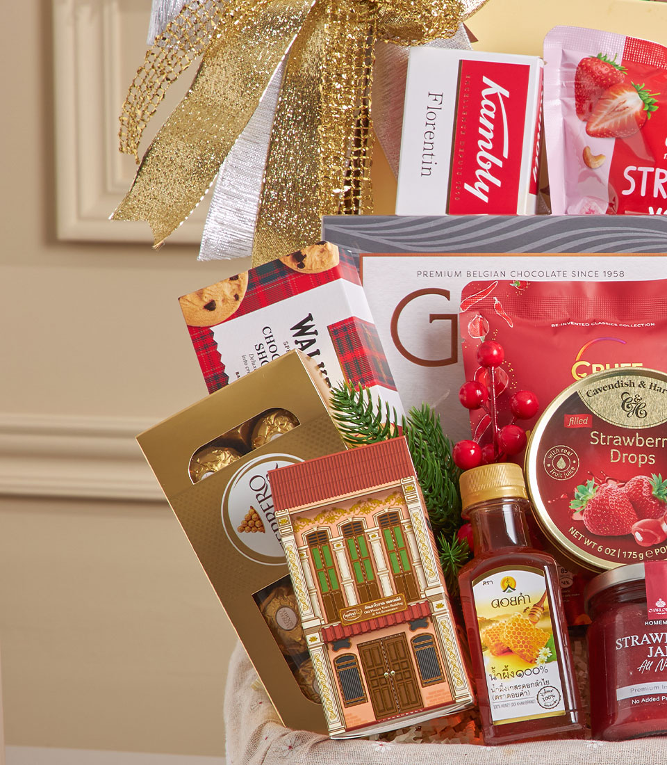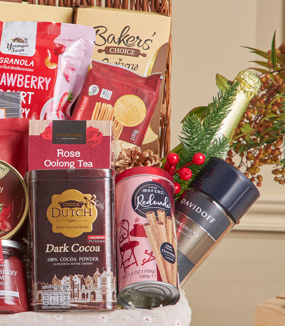 A luxurious basket with almond crackers, coconut rolls, Florentin biscuits, chili crackers, Ferrero Rocher, strawberry granola, Guylian chocolates, Walkers shortbread, paprika cashews, chocolate wafers, smoked paprika snacks, strawberry jam, Doi Kham honey, dark roast coffee, rose oolong tea, candy drops, dark cocoa and red grape juice.