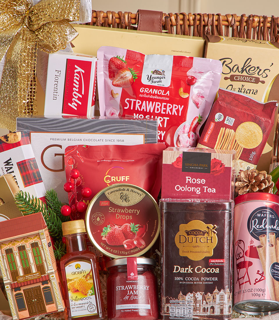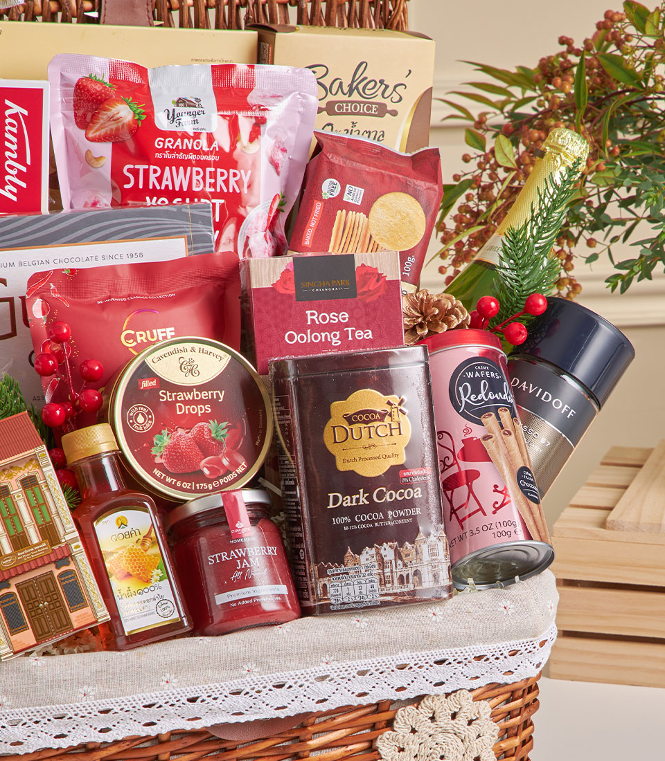 Signature Deluxe Strawberry & Chocolate Gift Basket A premium gourmet gift basket filled with strawberry treats, fine chocolates, artisan biscuits, cocoa, teas, and juices — an elegant choice for New Year celebrations and VIP gifting.
