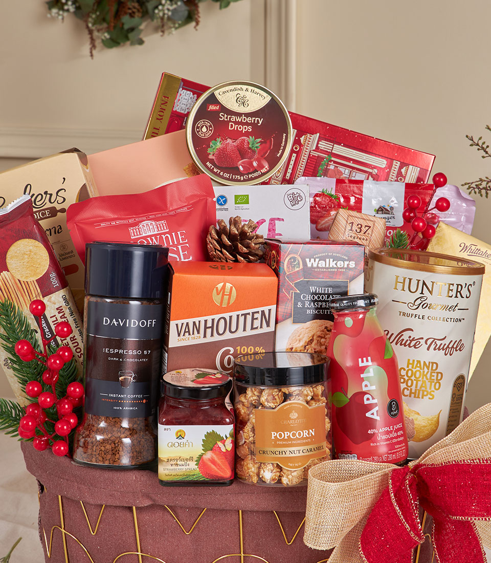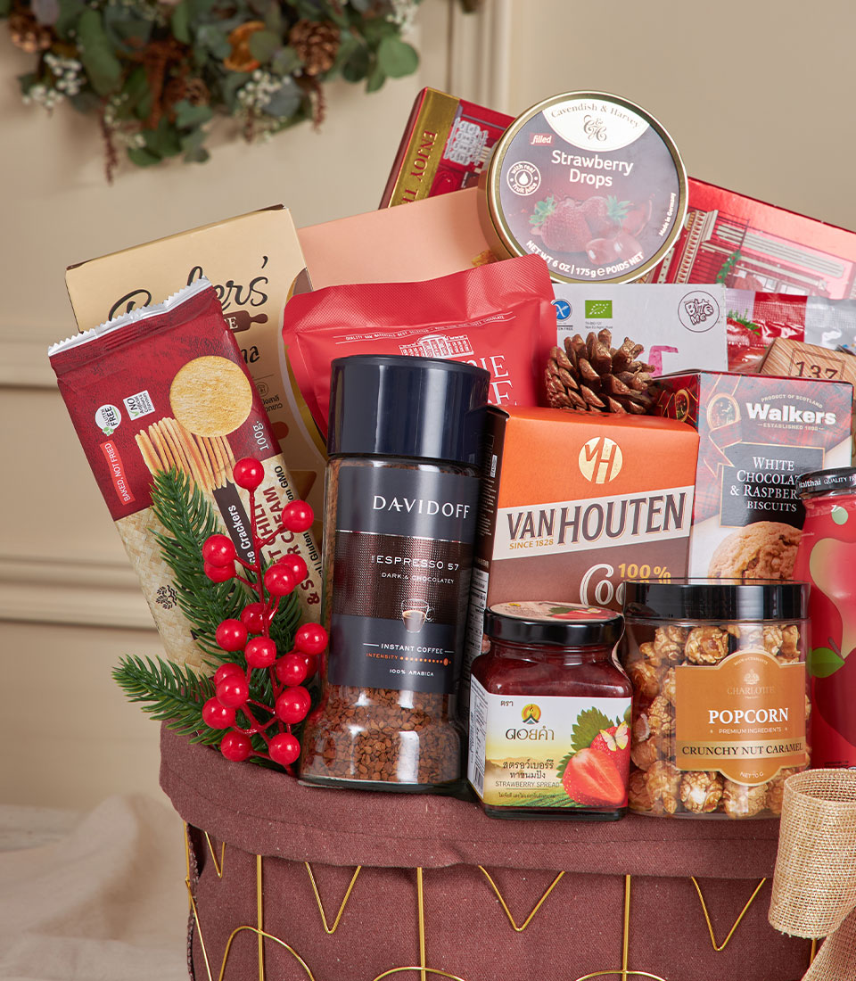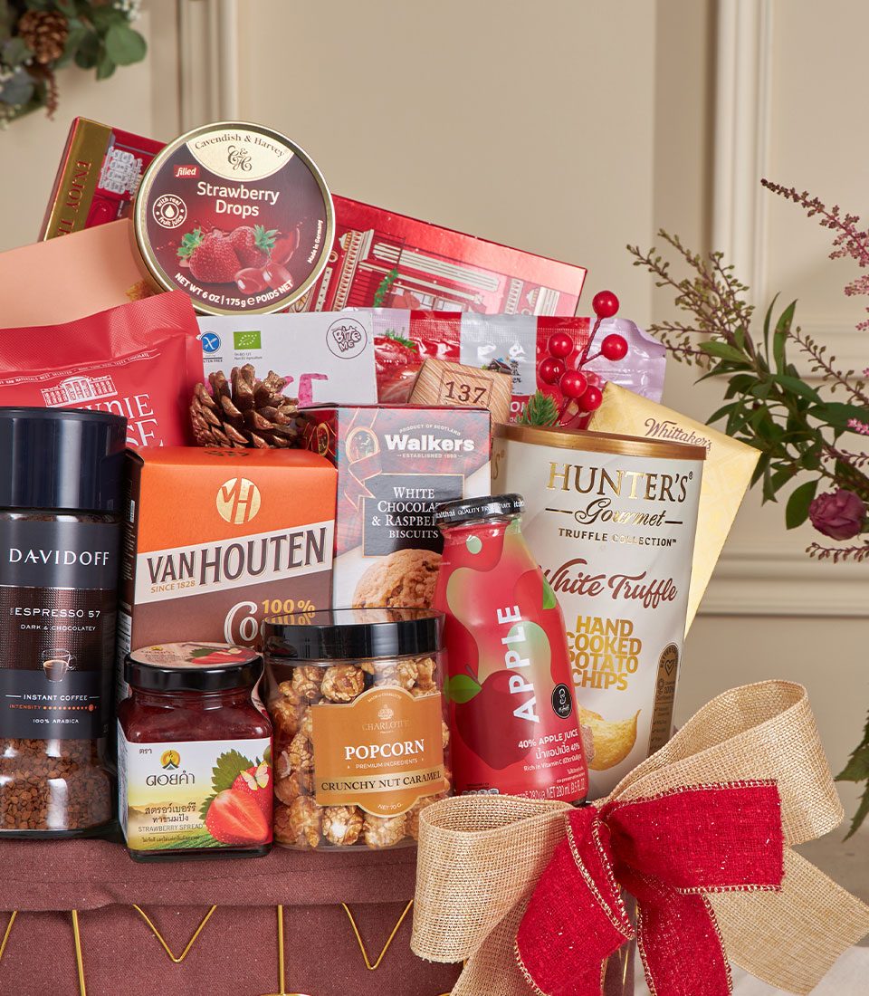 Grand Ruby Gourmet Basket A joyful ruby-toned gourmet basket generously filled with international biscuits, Thai snacks, artisan popcorn, premium chocolates, coffee, cocoa, juices and almond milk. Designed in Basketeer’s warm festive style, this abundant hamper brings colour, flavour and heartfelt celebration — perfect for New Year gifting, family occasions and corporate gift delivery in Bangkok.