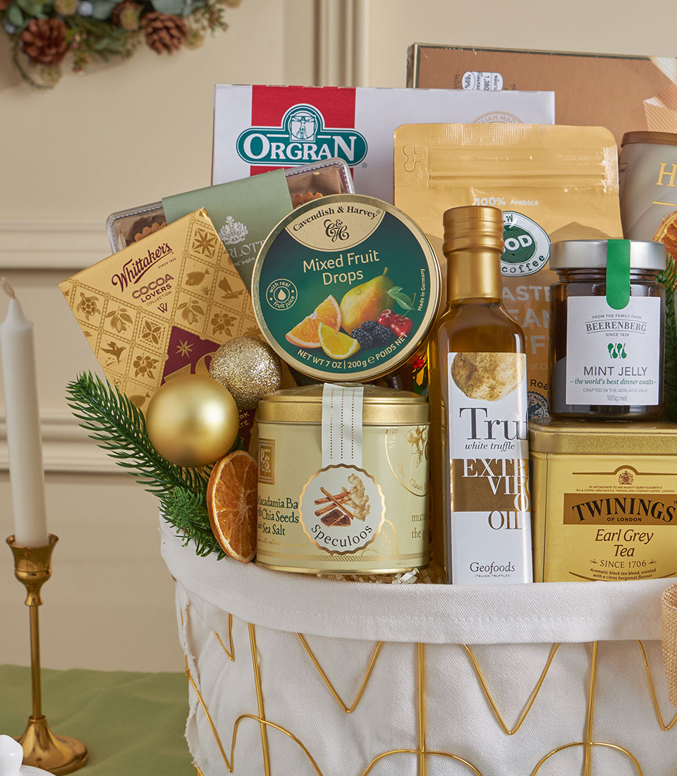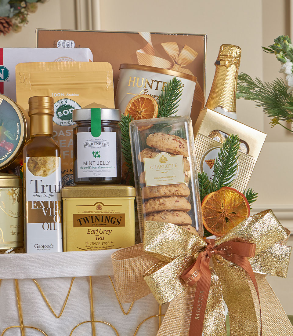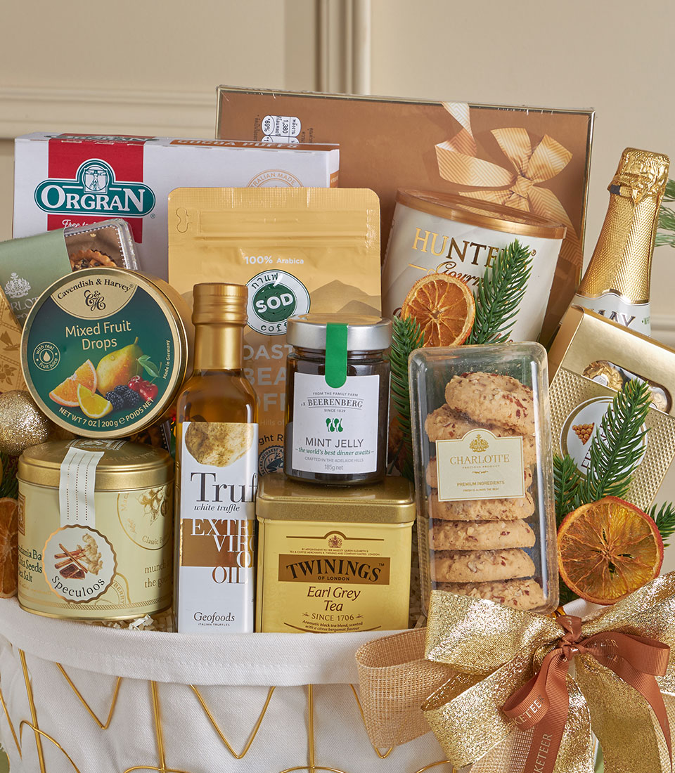 A luxurious gold-themed gourmet basket with premium cookies, truffle chips, chocolates, healthy seed tartlets, grape juice, coffee beans, and olive oil.