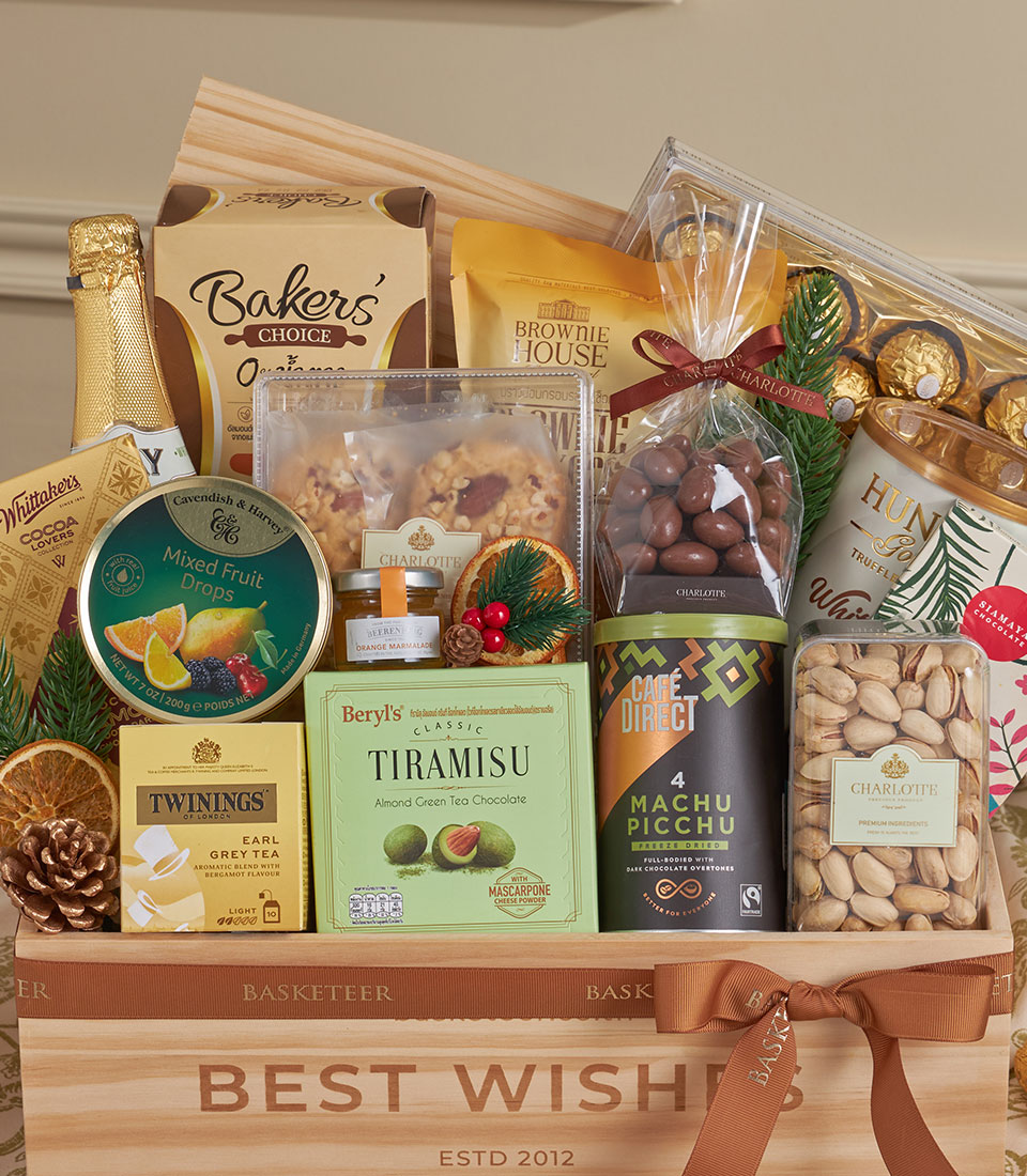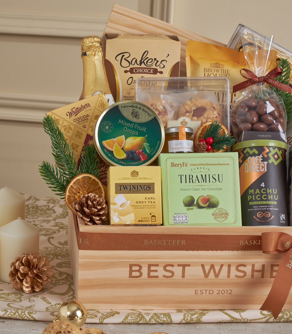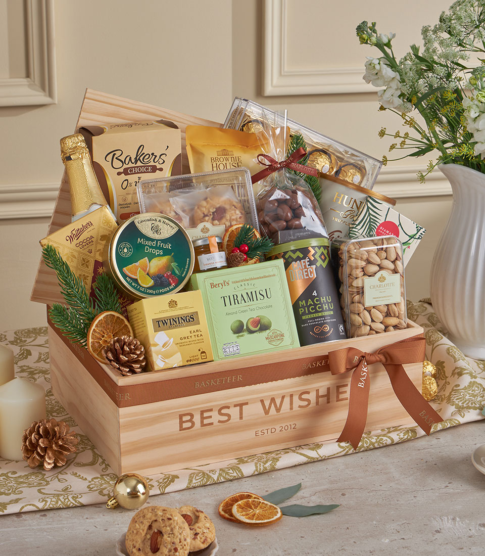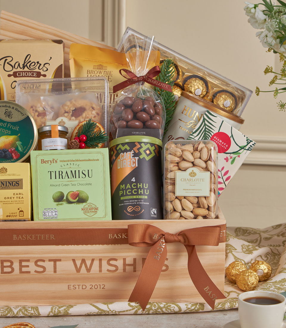 Best Wishes Premium Coffee, Chocolate & Snack Gift Box A refined wooden gift box curated with premium chocolate, roasted nuts, gourmet coffee, tea and wholesome snacks, paired with refreshing red grape juice. Beautifully presented with Basketeer’s signature ribbon, this elegant set is perfect for sending warm wishes, festive gifting, corporate appreciation and thoughtful celebrations in Bangkok.