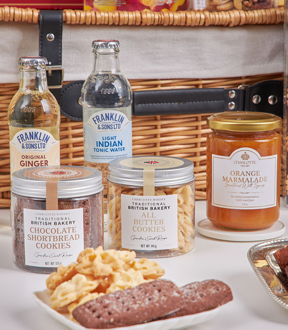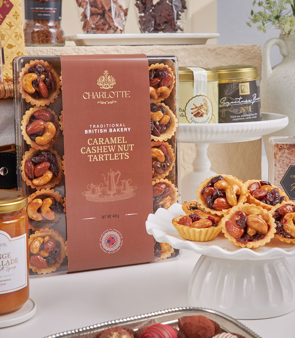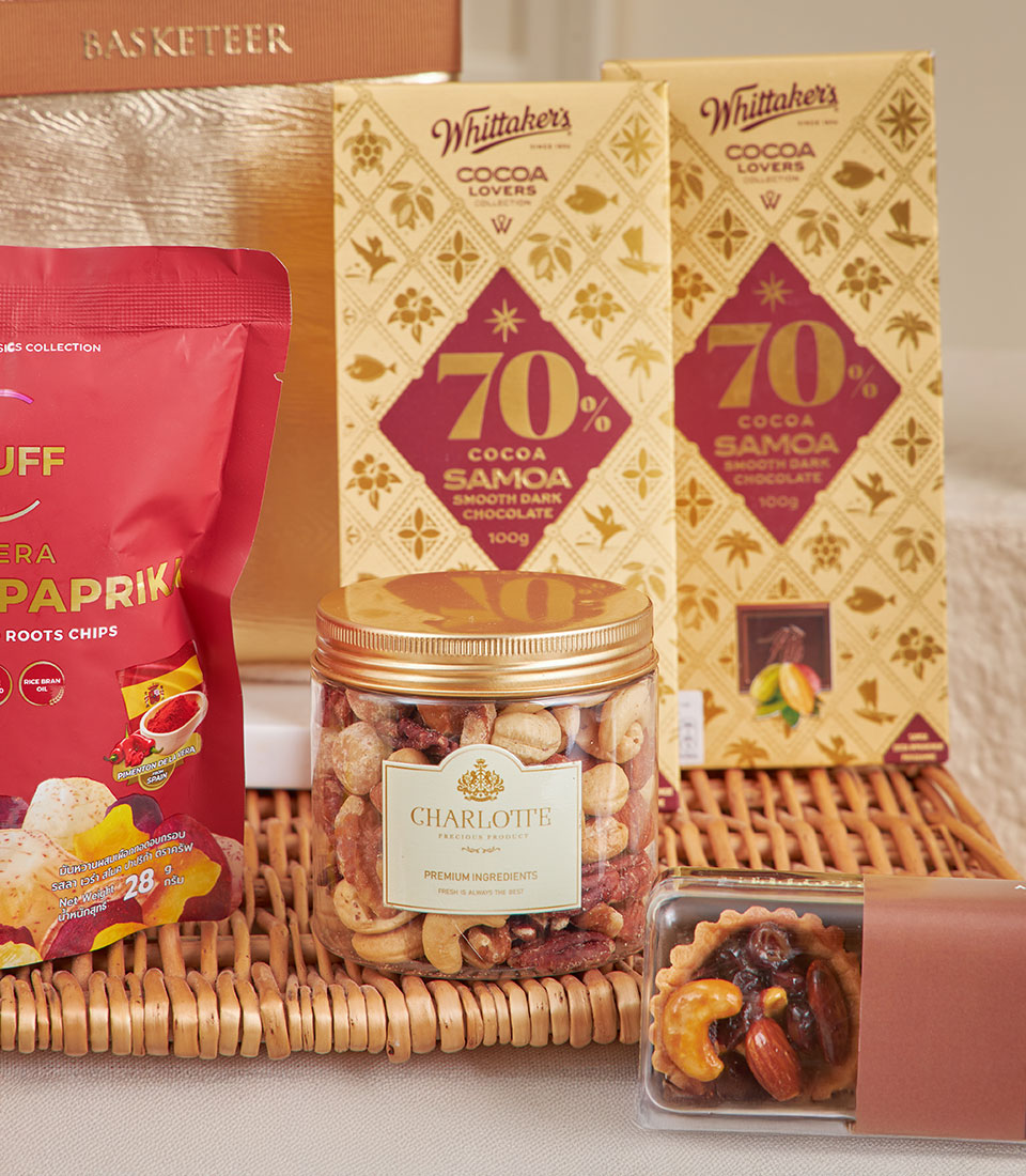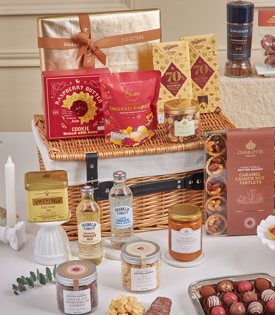 Grand Deluxe Chocolate & Tea Collection Our most indulgent gourmet hamper, generously filled with premium chocolates, cookies, nuts, teas, coffee and specialty sweets, styled on a grand dessert-table display to impress at first sight.