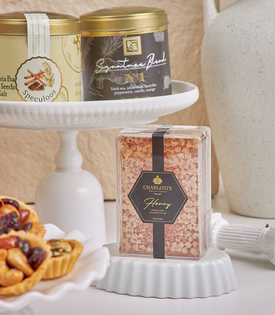 An impressive dessert‑table style set with pralines, cookies, nuts, coffee, honey, jam and signature tea – designed for offices, parties and VIP gifting.