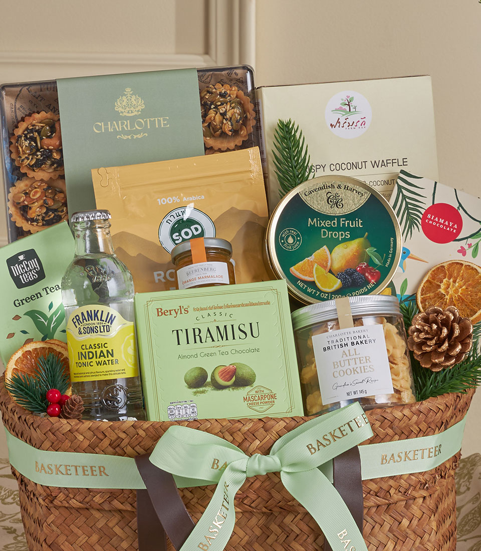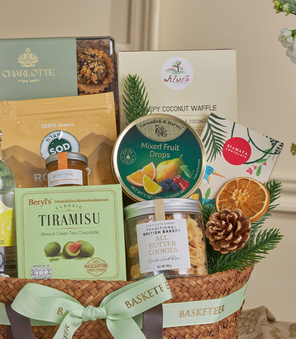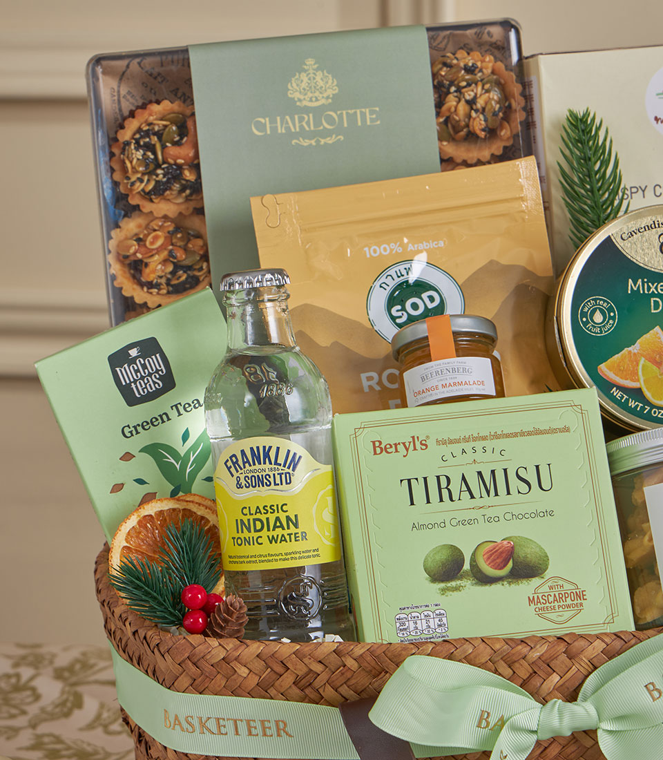 Healthy Tea, Honey & Dark Chocolate Gift Basket A wholesome premium gift basket curated with organic honey, seed tartlets, artisanal coffee, tonic water and fine dark chocolate, beautifully presented in a natural woven handle basket with Basketeer’s signature ribbon. Ideal for wellness gifting, refined celebrations and thoughtful occasions in Bangkok.