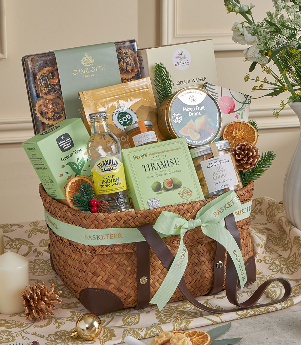 A refreshing green-themed gourmet basket filled with honey, premium cookies, mixed seed tartlets, tea, chocolate, and light roasted coffee.