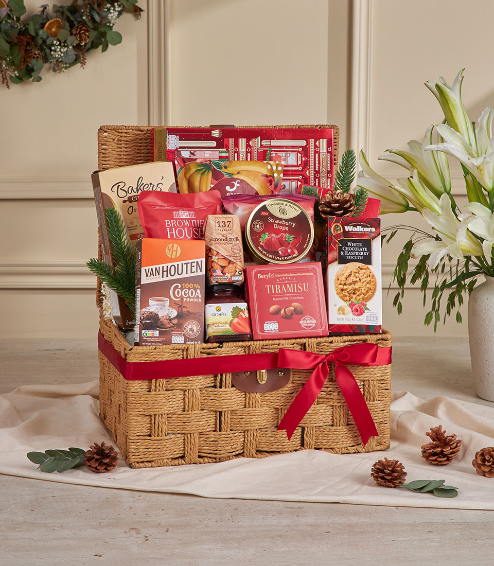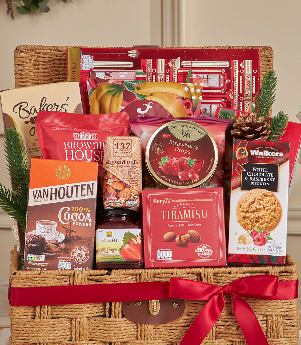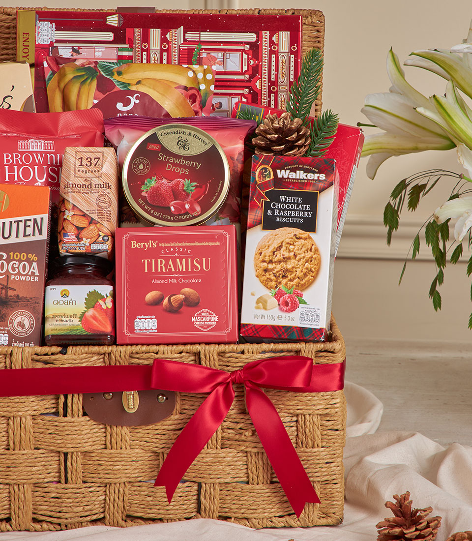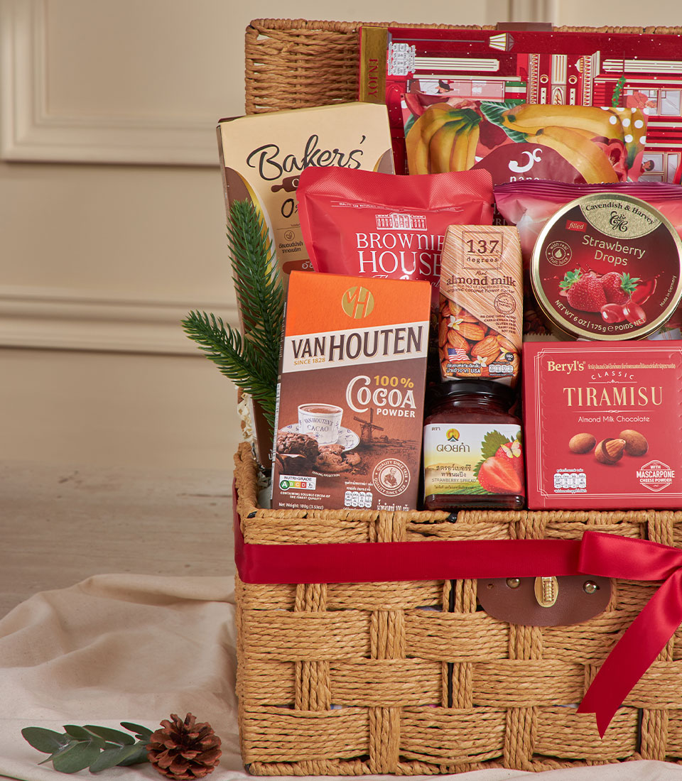 Red Harmony Celebration Gift Basket A joyful and festive woven hamper curated with a generous assortment of cookies, premium snacks, cocoa, almond milk and delightful strawberry-themed treats. Bright and welcoming in warm red tones, this gift basket embodies celebration and togetherness — perfect for New Year gifting, family occasions, and heartfelt festive presents in Bangkok.