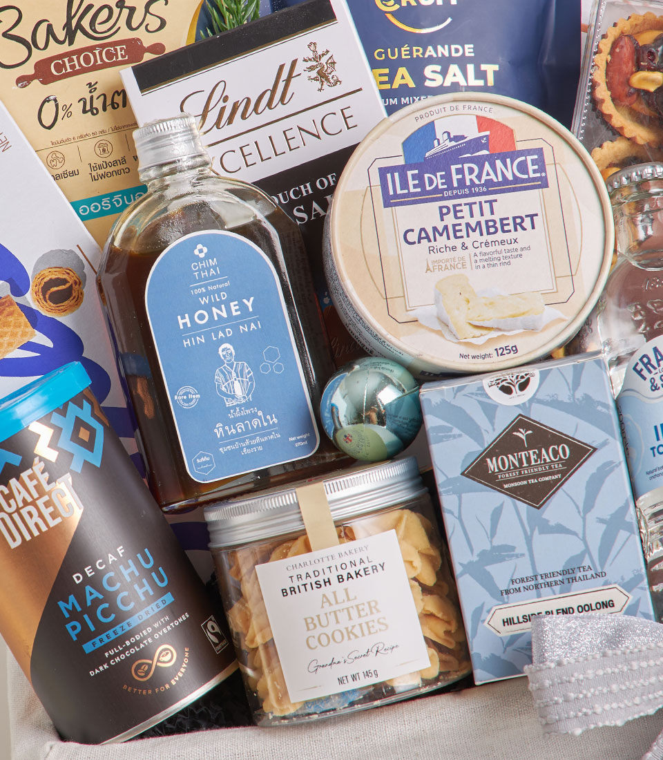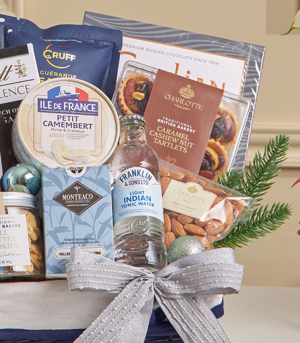 A premium gourmet basket with crackers, chocolates, Camembert cheese, coffee and cookies.