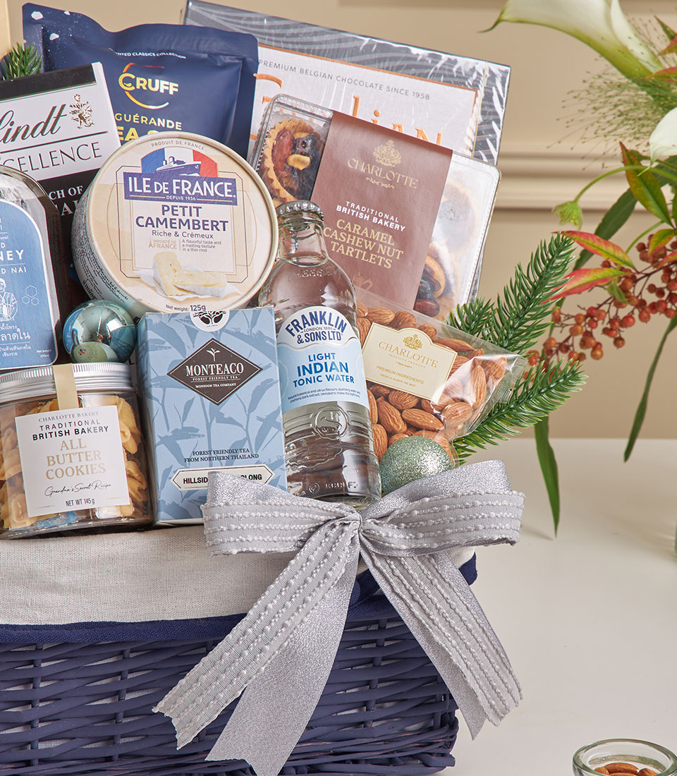 Blue Gourmet Indulgence Gift Basket A refined selection of premium chocolates, artisanal snacks, cheese, honey, and specialty drinks — beautifully presented in a modern blue-themed basket, perfect for elegant and meaningful gifting.