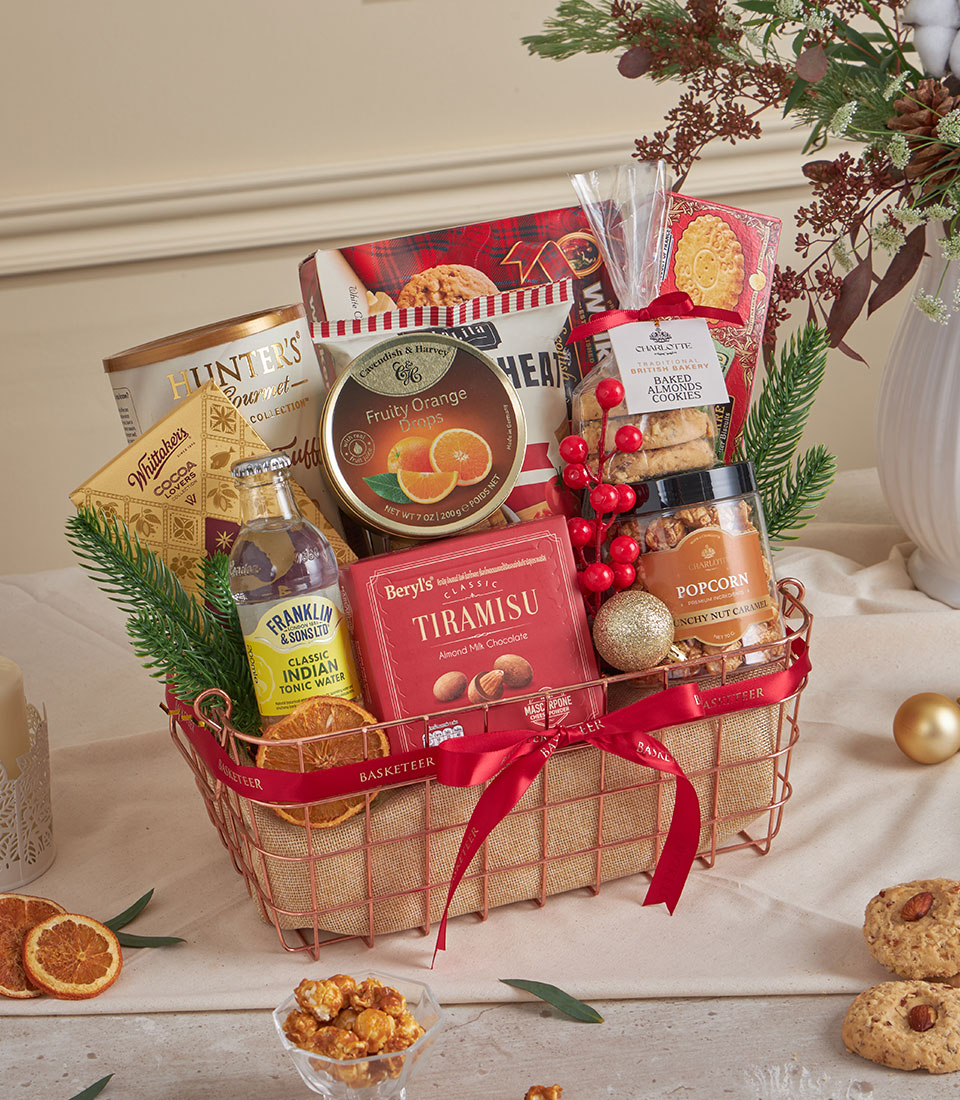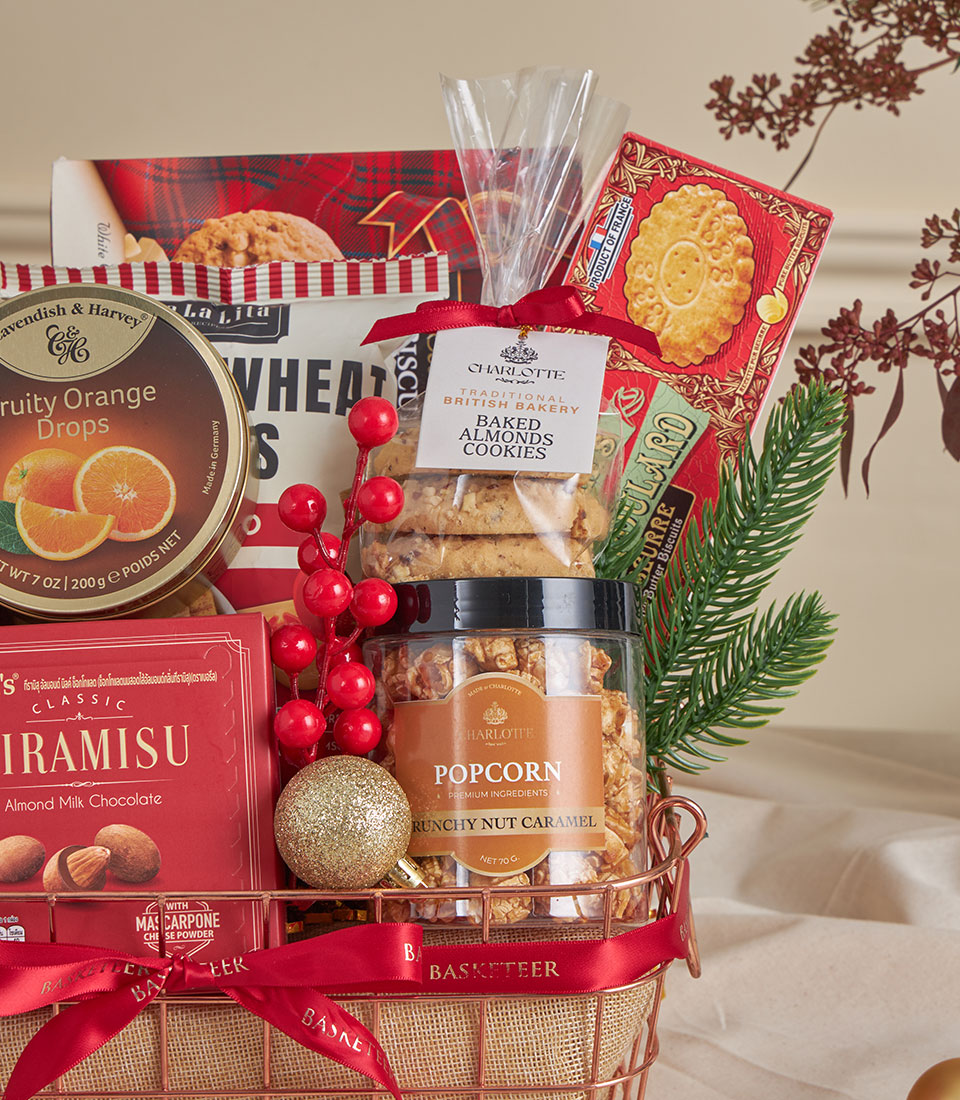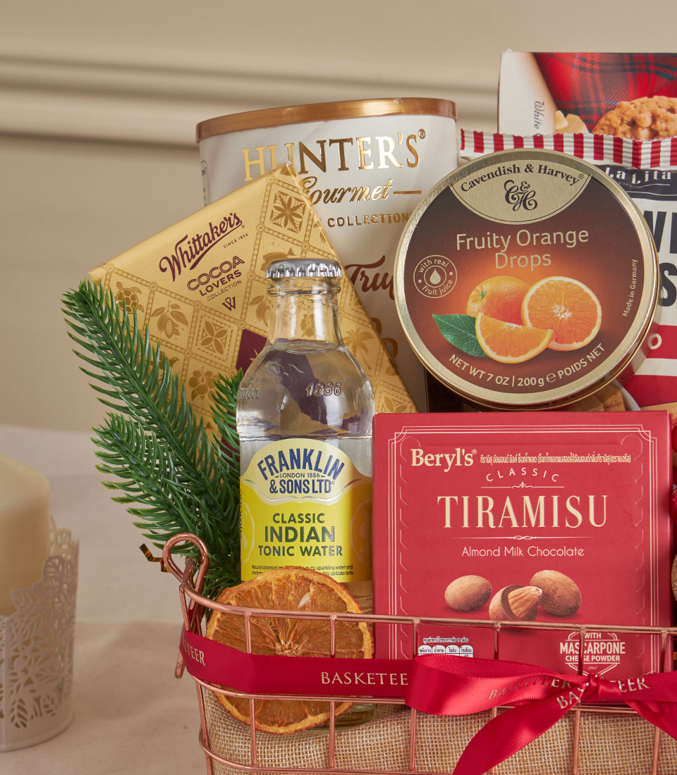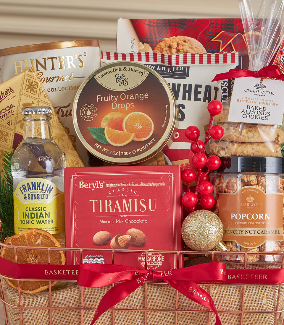Red Tiramisu & Truffle Holiday Basket A festive red hamper combining tiramisu almond chocolates, citrus candies, baked almond cookies, crunchy nut caramel popcorn, whole wheat chips, premium tonic water, white truffle chips, pure butter biscuits, assorted Walkers cookies and dark chocolate. A luxurious yet playful set for holiday gatherings and heartfelt gifting.