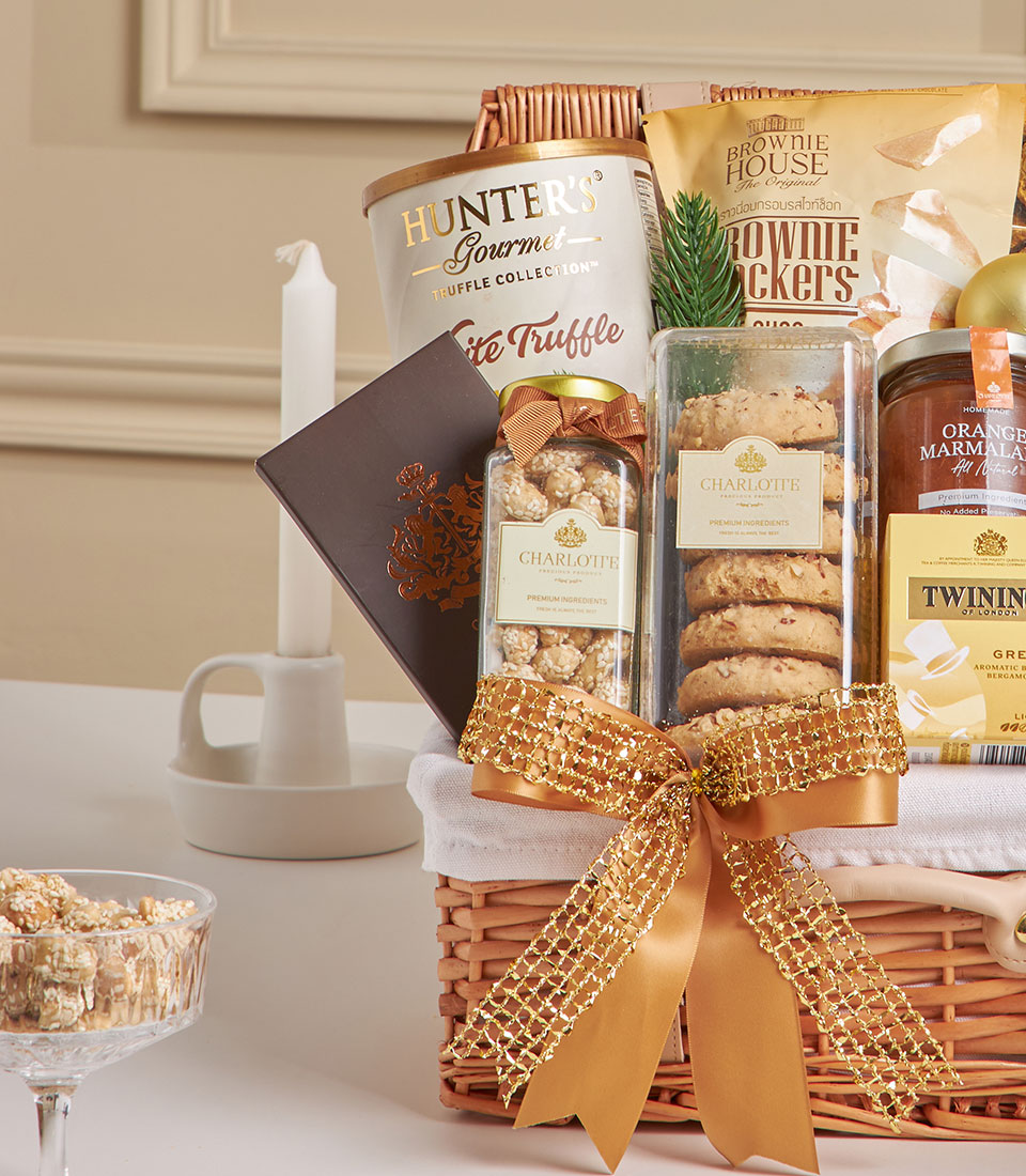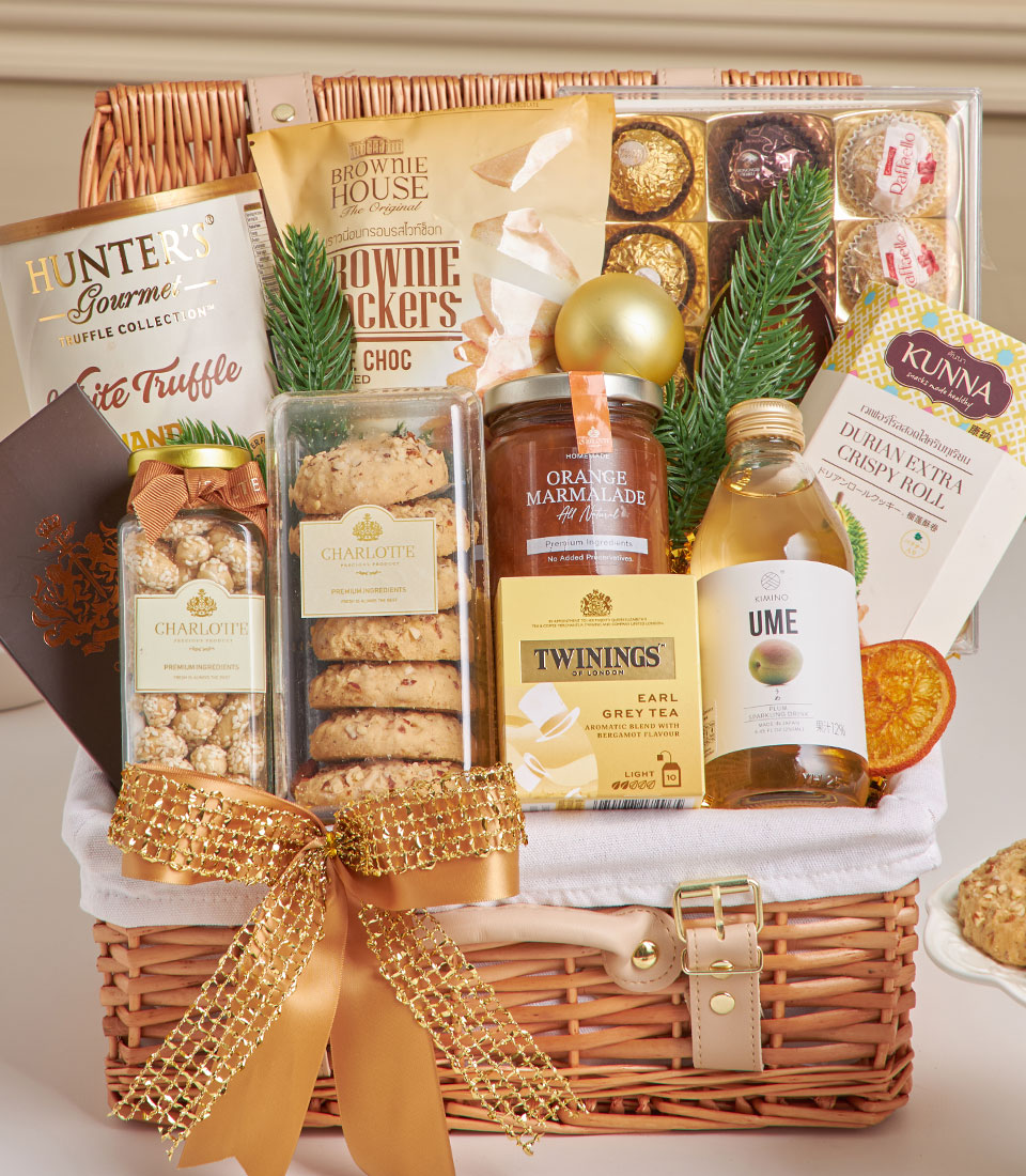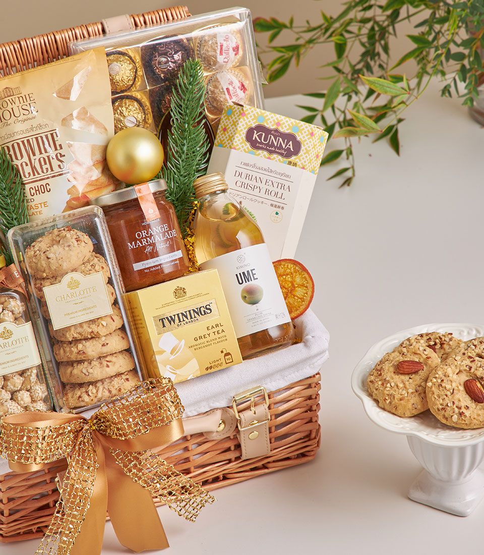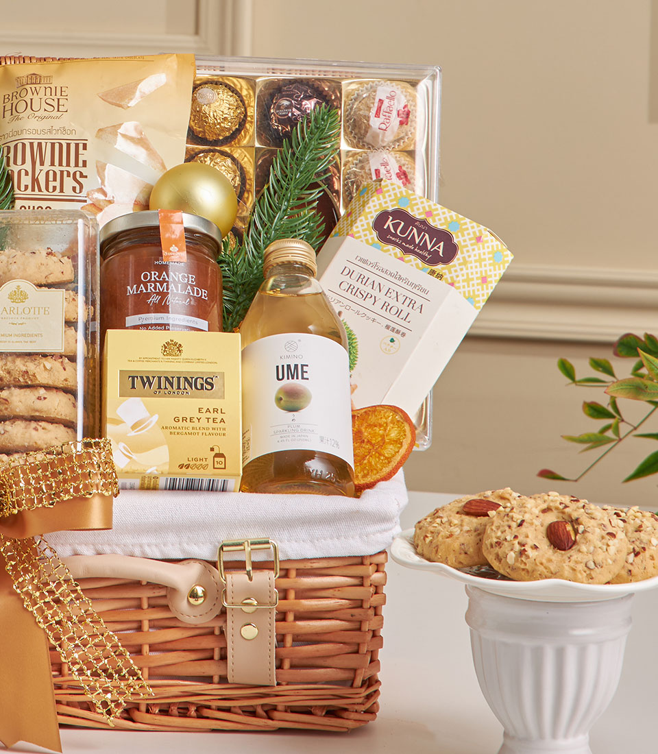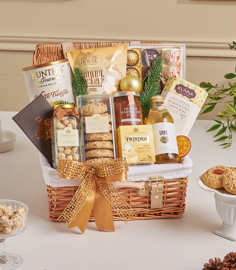 A thoughtfully curated gourmet hamper featuring Hunters white truffle potato chips, brownie white chocolate crackers, Ferrero Collection, Charlotte milk chocolate bar, sesame cashew nuts, almond cookies, orange marmalade, Earl Grey tea, sparkling ume drink, and Kunna durian crispy roll. A warm and elegant gift perfect for celebrations and heartfelt occasions in Bangkok.