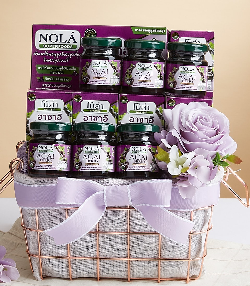 Superfood Drink Hamper with Nola Acai Berry Infused Beverage Nola Acai Berry Infused Beverage is a concentrated, sugar-free superfood drink that harnesses the power of 100% pure Acai berries. Acai berries are renowned for their high antioxidant content, which ranks among the highest in the world. The presence of anthocyanins in Acai berries plays a vital role in protecting against cell damage and combating the free radicals that contribute to premature aging. This ready-to-drink superfood beverage is low in calories. The Nola Gift Hamper represents love and care, suitable for any occasion and all genders and ages.