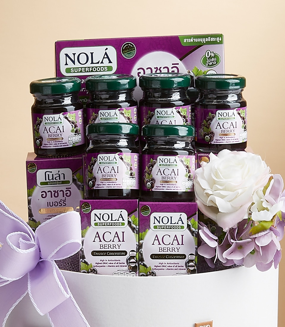 Superfood Drink Hamper with Nola Acai Berry Infused Beverage Nola Acai Berry Infused Beverage is a concentrated, sugar-free superfood drink that harnesses the power of 100% pure Acai berries. Acai berries are renowned for their high antioxidant content, which ranks among the highest in the world. The presence of anthocyanins in Acai berries plays a vital role in protecting against cell damage and combating the free radicals that contribute to premature aging. This ready-to-drink superfood beverage is low in calories. The Nola Gift Hamper represents love and care, suitable for any occasion and all genders and ages.