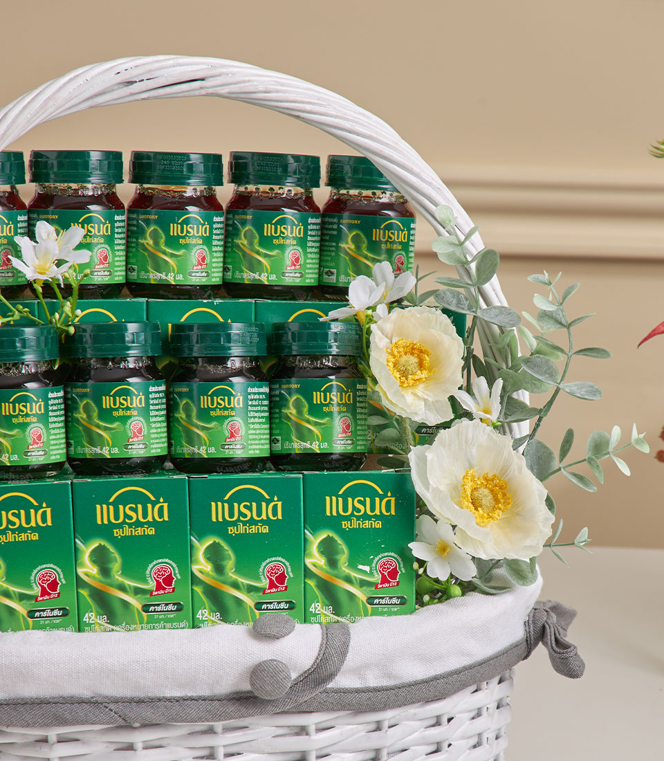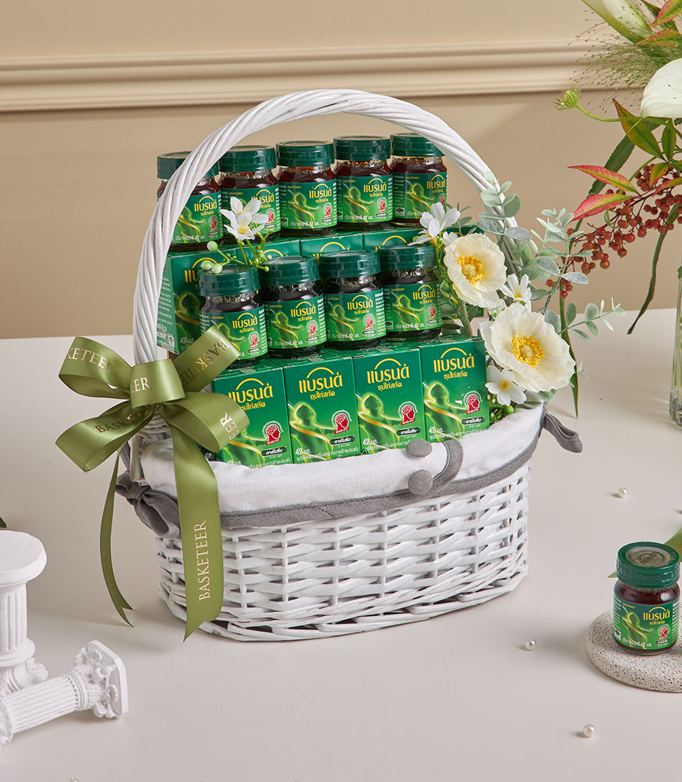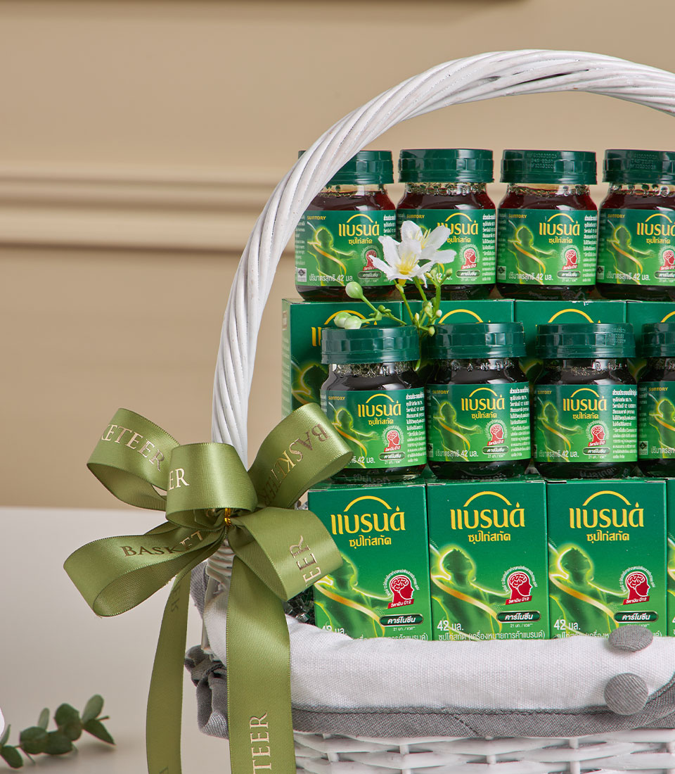 Premium Chicken Essence Wellness Basket A classic white wicker basket featuring Brand’s chicken essence bottles, thoughtfully decorated with fresh green accents, ideal for sending care, strength and well-wishes.