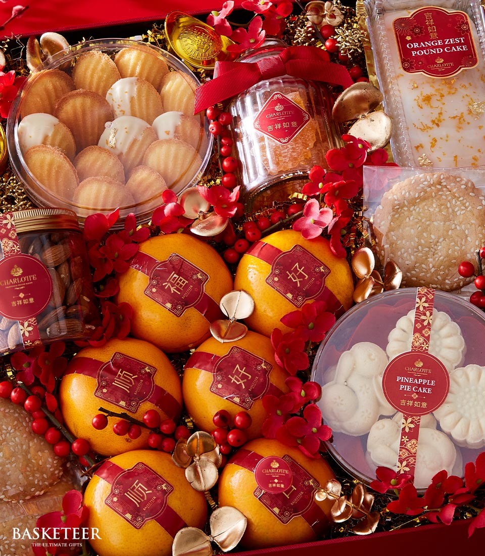 Celebrate Lunar New Year with a festive hamper featuring oranges, pineapple cakes, cookies, nuts, and traditional desserts.