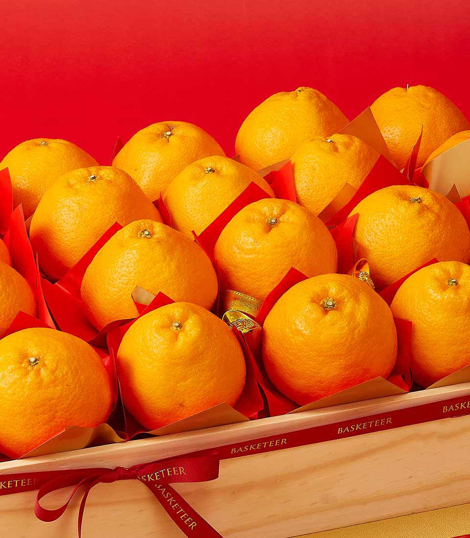 Celebrate Chinese New Year with a wooden crate of Dekopon oranges, wrapped in red ribbons and gold foil, featuring dragon design and peach blossoms.