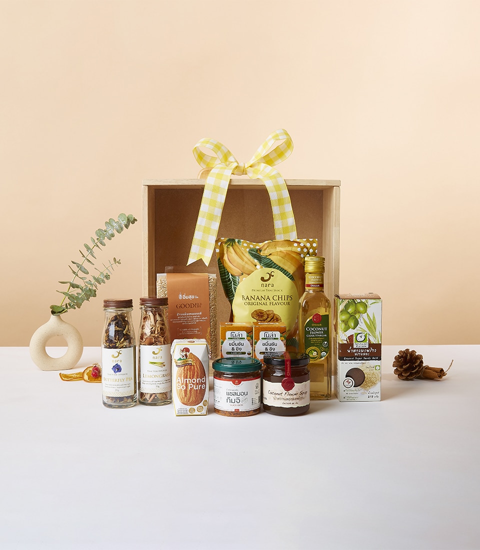 Premium Healthful Gift Box Experience the authentic flavors of Thailand with the Premium Thai Delights Gift Set. Thoughtfully curated and beautifully packaged in a wooden box adorned with a cheerful yellow gingham ribbon, this gift set offers a delightful assortment of high-quality Thai products perfect for food enthusiasts and loved ones alike.