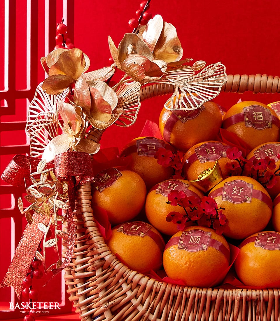 Celebratory Mandarin Orange Elegance Gift Embrace the spirit of prosperity with the "Golden Prosperity Mandarin Basket." Filled with premium mandarins symbolizing abundance and fortune, this stunning basket is adorned with gold accents and festive floral touches. A perfect gift for family, friends, or business associates, it represents wealth and good luck for the Lunar New Year. Celebrate tradition in style with this elegant offering.