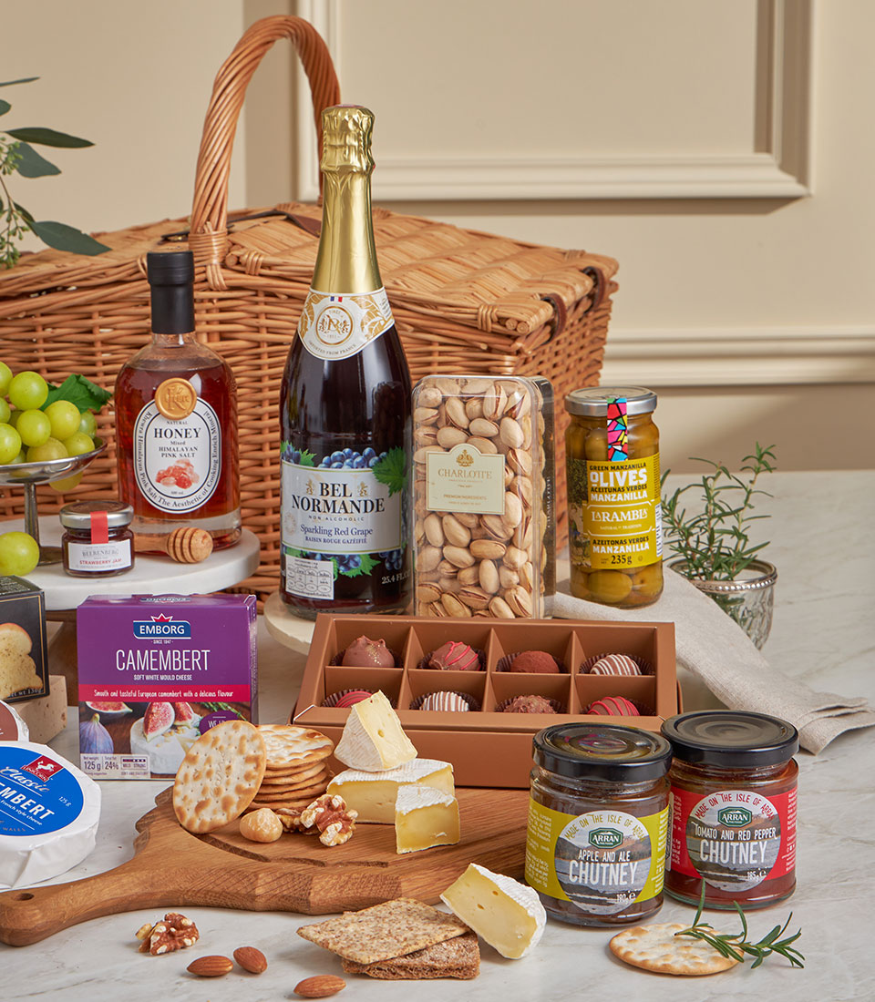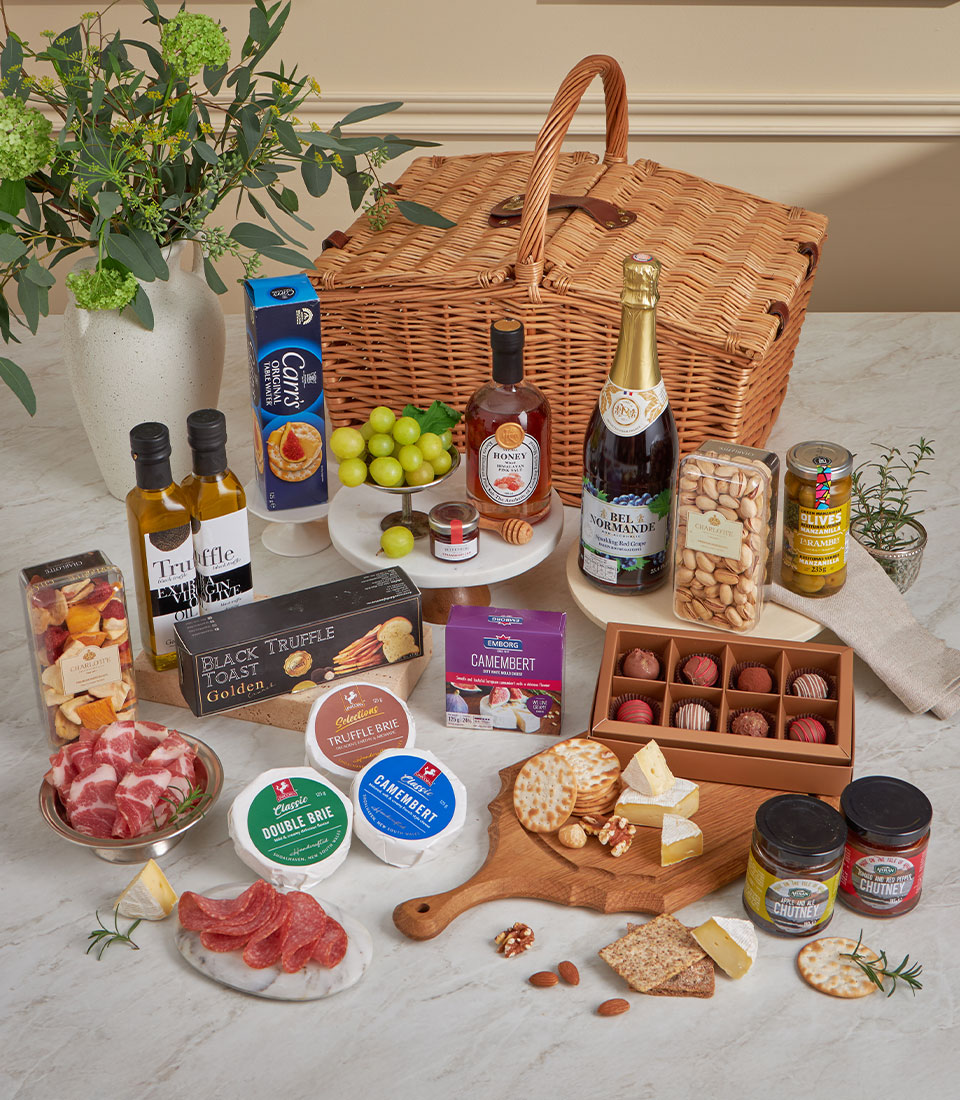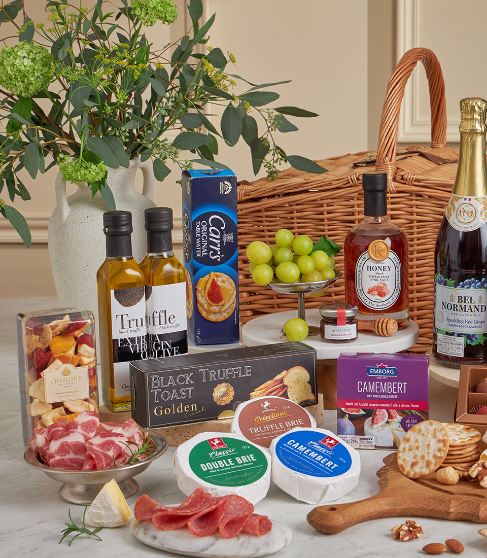 Luxury Cheese & Gourmet Celebration Hamper A refined curation of artisanal cheeses, premium charcuterie, truffle delights, and speciality pantry favourites — presented in an elegant wicker basket.