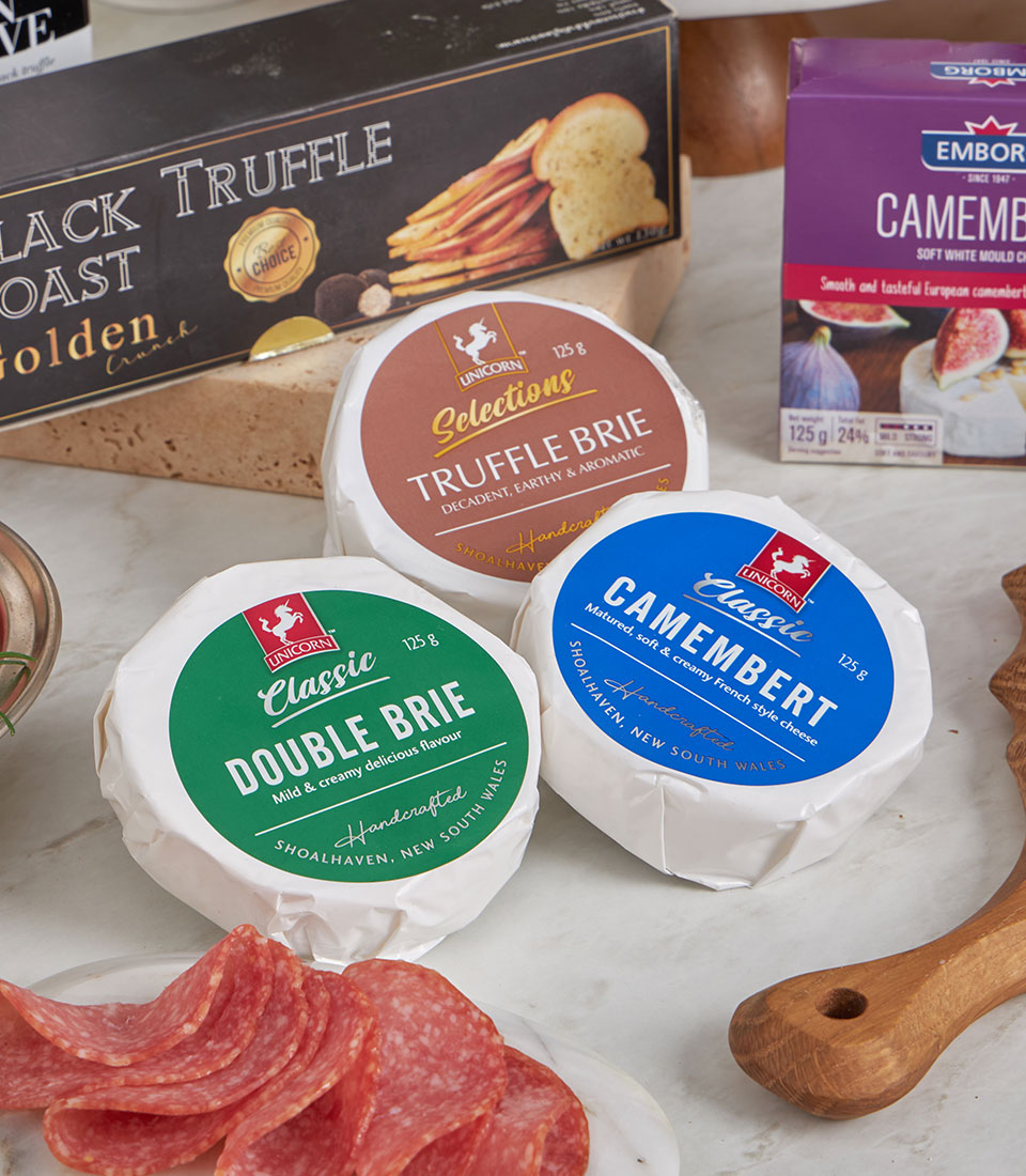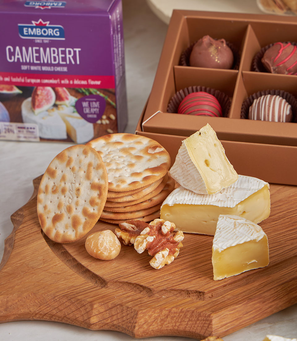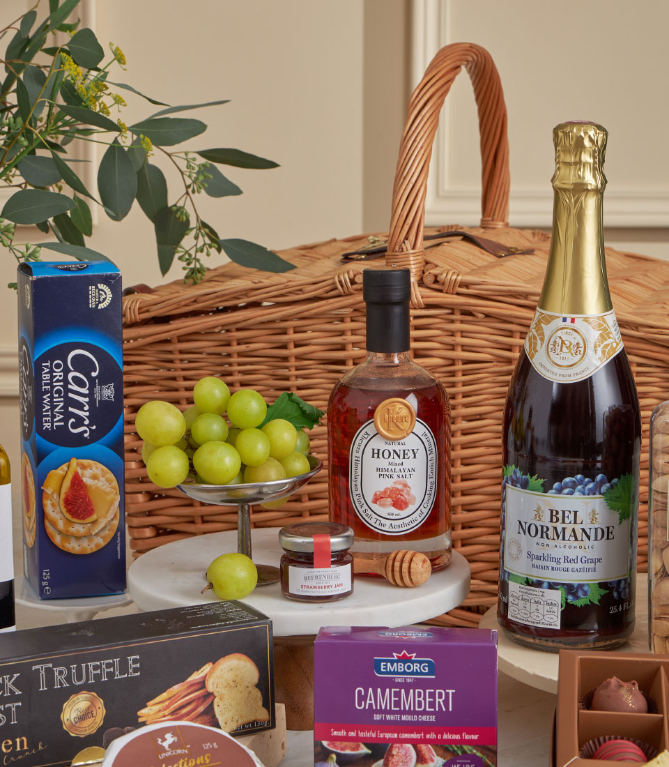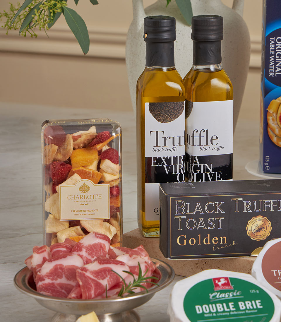 Luxury Cheese & Gourmet Celebration Hamper A refined curation of artisanal cheeses, premium charcuterie, truffle delights, and speciality pantry favourites — presented in an elegant wicker basket.