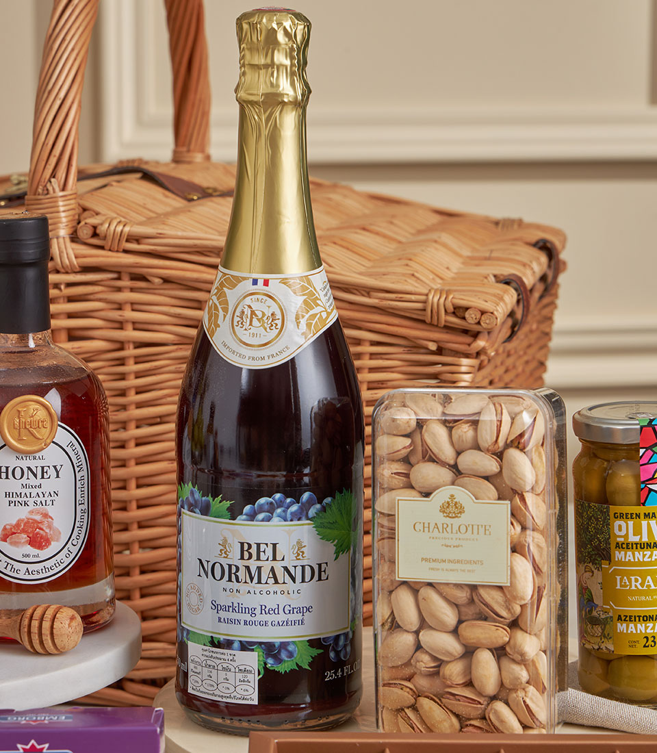 A prestige gourmet selection featuring imported cheeses, sparkling beverage, nuts, truffle delights and artisanal pairings — crafted for refined gifting with timeless luxury.