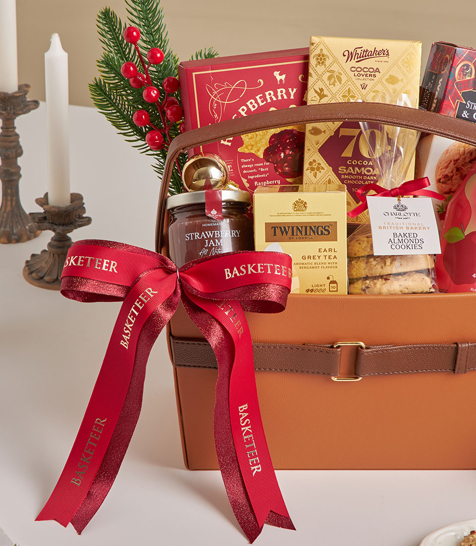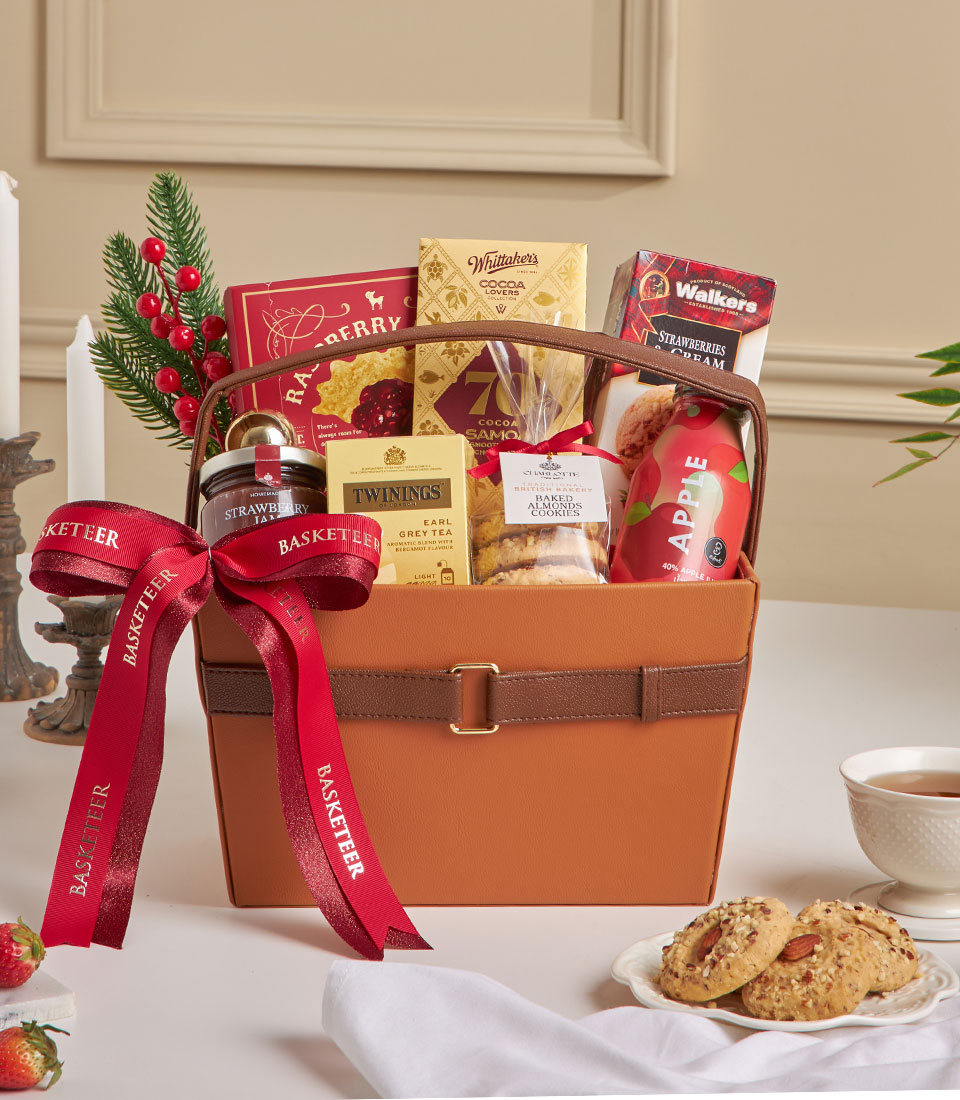 Raspberry & Chocolate Delight Gift Basket A refined leather-style gift basket with raspberry biscuits, dark chocolate, Earl Grey tea, strawberry jam, and almond cookies — a charming choice for festive greetings and thank-you gifts.