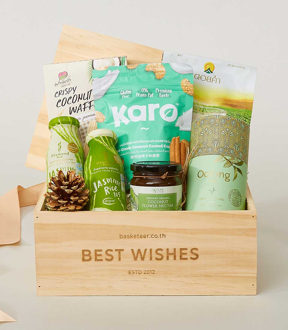 Global Goodness Wooden Box Show your loved ones you care with the Healthy Gourmet Gift Basket, a thoughtfully curated selection of premium health-focused snacks and beverages, perfect for any occasion. This beautifully crafted wooden crate, emblazoned with "Best Wishes," is filled with nutritious and delicious treats that will delight health enthusiasts and food lovers alike.