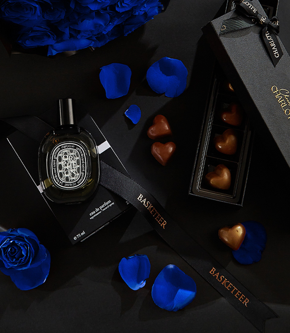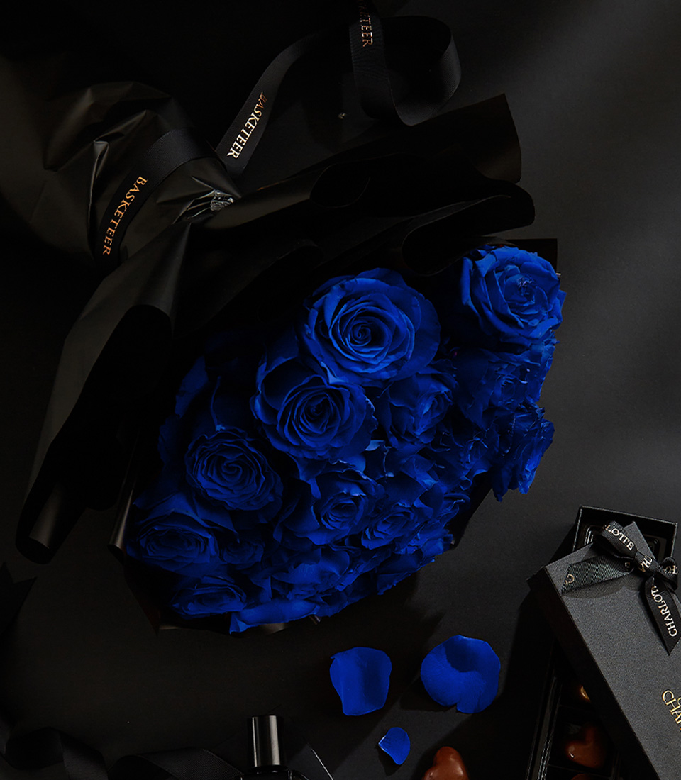 Surprise your love with luxury blue roses, perfume & chocolate. A sophisticated, romantic gift for Valentine's Day. Order now!