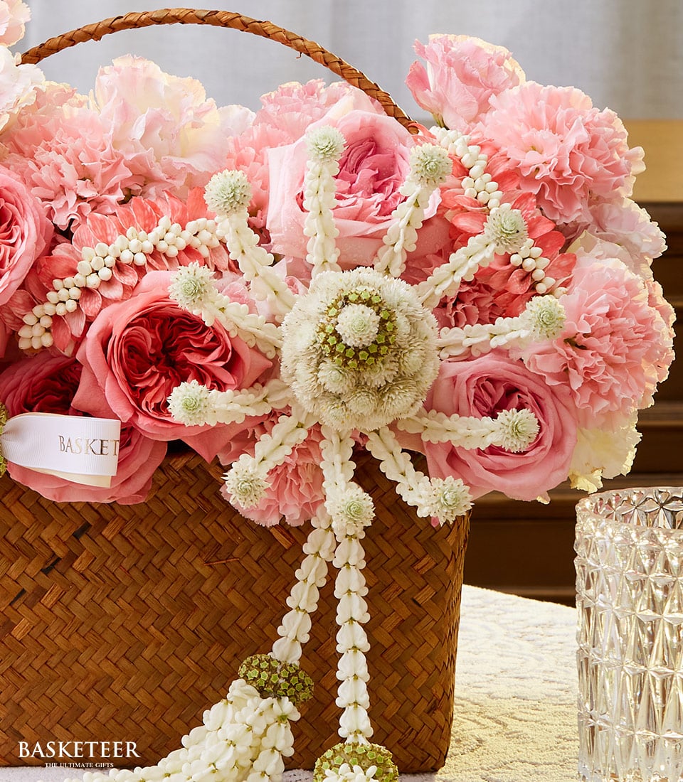 Pink Roses In Thai Basket This Blush Pink Floral Tribute Basket is an exquisite arrangement of delicate pink roses, carnations, and handcrafted jasmine garlands, beautifully presented in a woven basket. A symbol of love, appreciation, and elegance, this floral piece is ideal for special occasions, heartfelt tributes, and meaningful gifts.