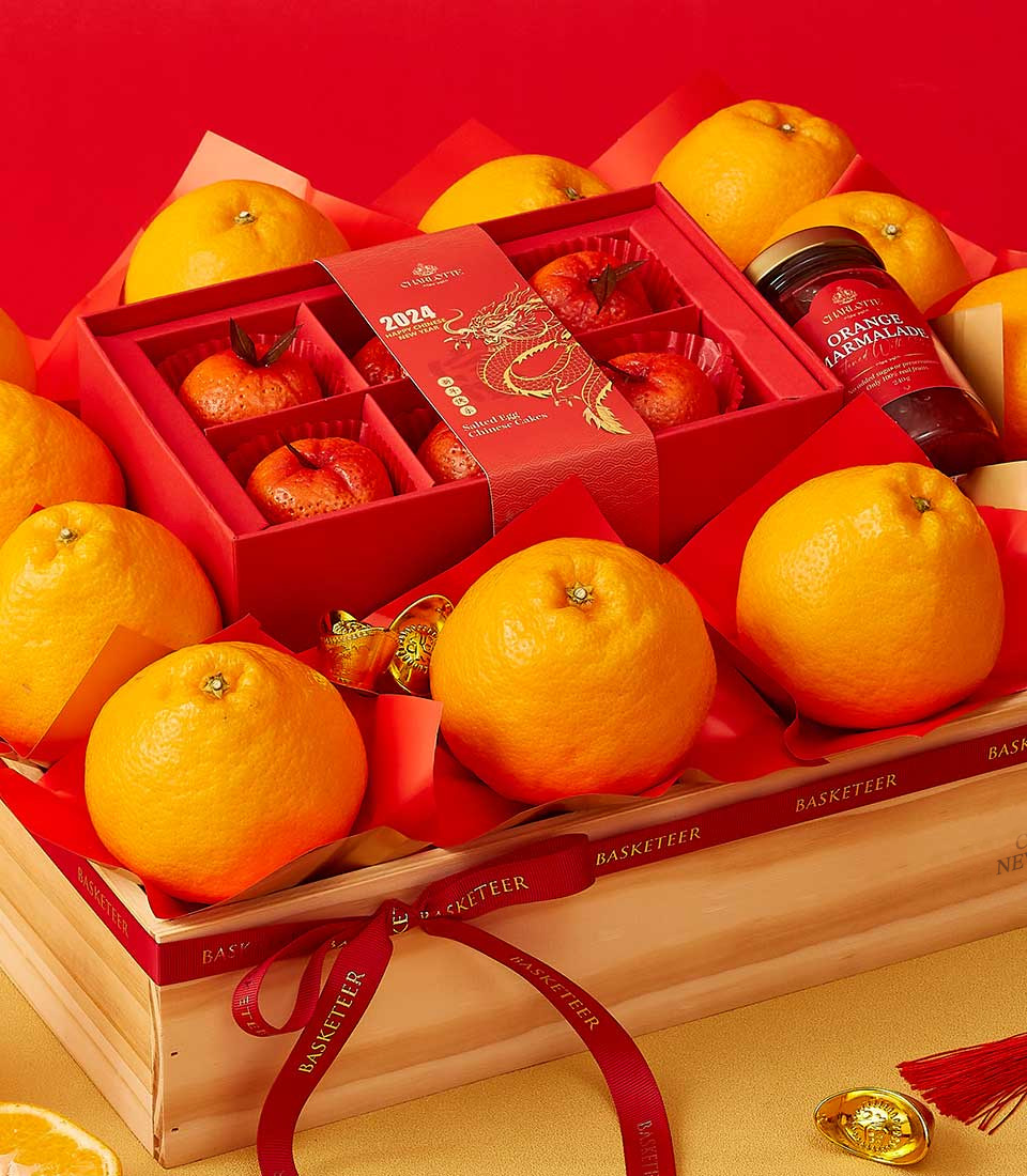 Celebrate the Lunar New Year with a premium gift box of fresh mandarin oranges, festive pastries, and orange marmalade, perfect for prosperity wishes.