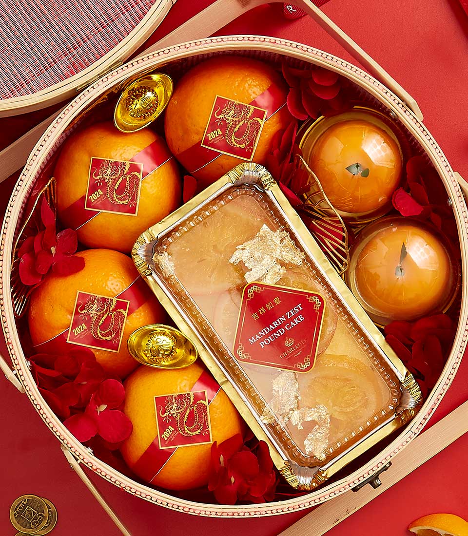 CNY : Serenity Lunar New Year Delights Gift Celebrate prosperity with the Lunar New Year Mandarin Cake & Orange Basket. Featuring fresh mandarin oranges, a luxurious mandarin zest pound cake, and gold ingot accents, this festive gift basket is perfect for sharing joy and good fortune.