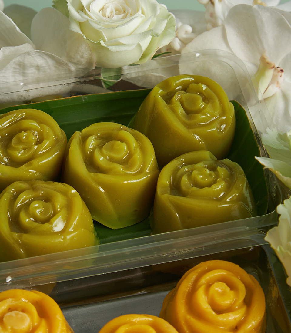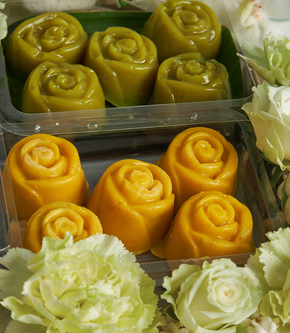 Celebrate Songkran with a trio of Thai sweets in a wooden box, adorned with jasmine and orchid blooms—an elegant and thoughtful festive gift.