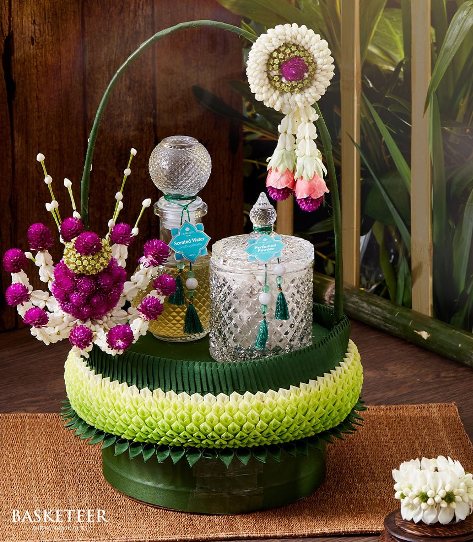 Thai Heritage Songkran Perfume Set This elegant Thai water blessing set features beautifully designed crystal holy water bottles, handcrafted floral garlands, and a decorative banana leaf pedestal. Perfect for Buddhist rituals, merit-making, Songkran, and spiritual gifting.