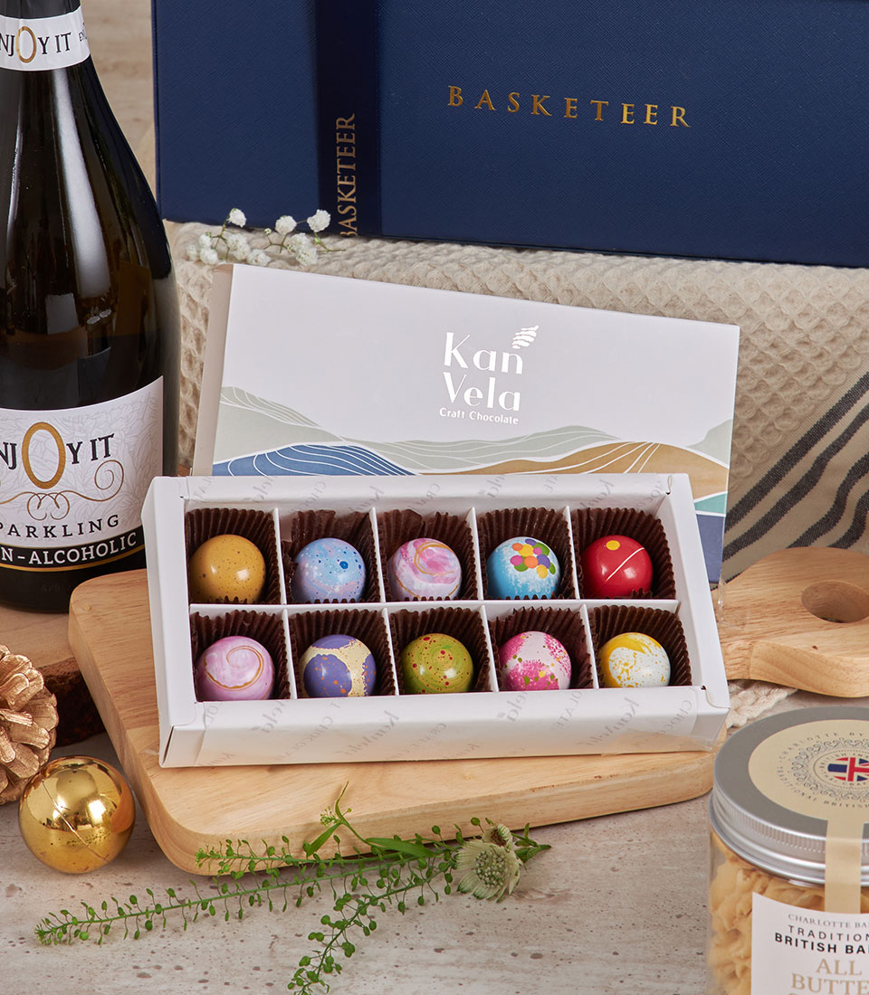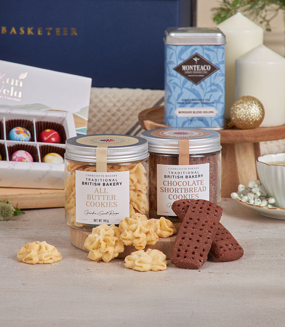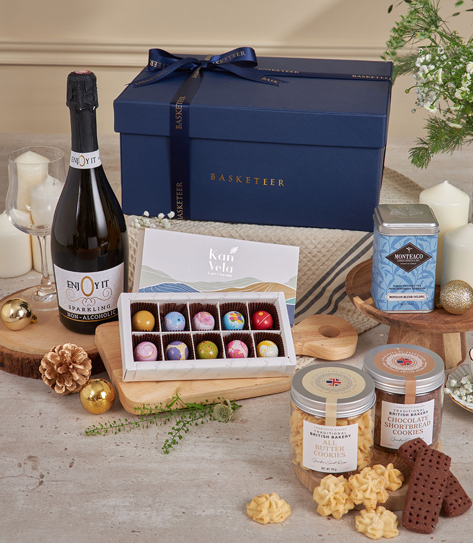 Sparkling Celebration Gourmet Gift Basket A luxurious navy-themed hamper featuring non-alcoholic sparkling beverage, artisan bonbons, buttery cookies, premium shortbread and fragrant lychee oolong tea. Crafted in Basketeer’s refined signature style, this elegant gift basket brings a touch of celebration, warmth and sophistication — perfect for New Year gifting, corporate occasions and meaningful festive moments in Bangkok.