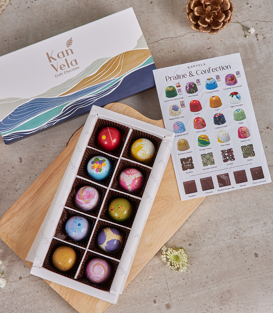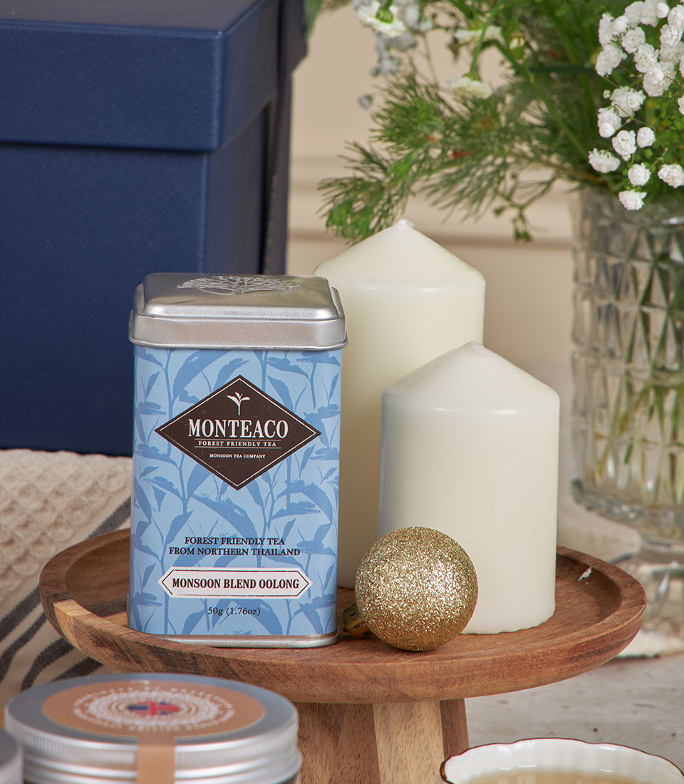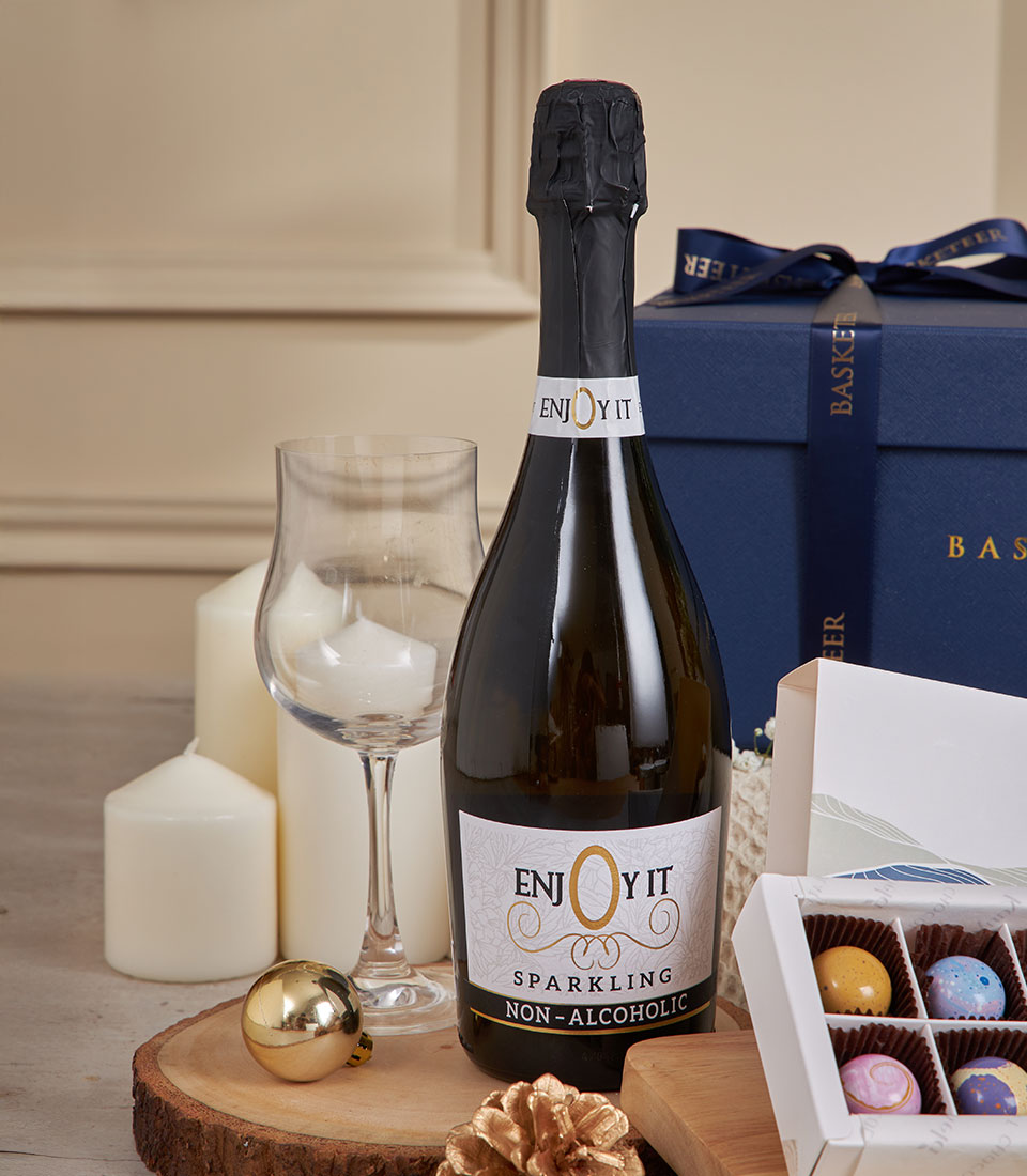 Festive set with non-alcoholic sparkling drink, artisan bonbons, butter and shortbread cookies and lychee oolong tea for joyful celebrations.