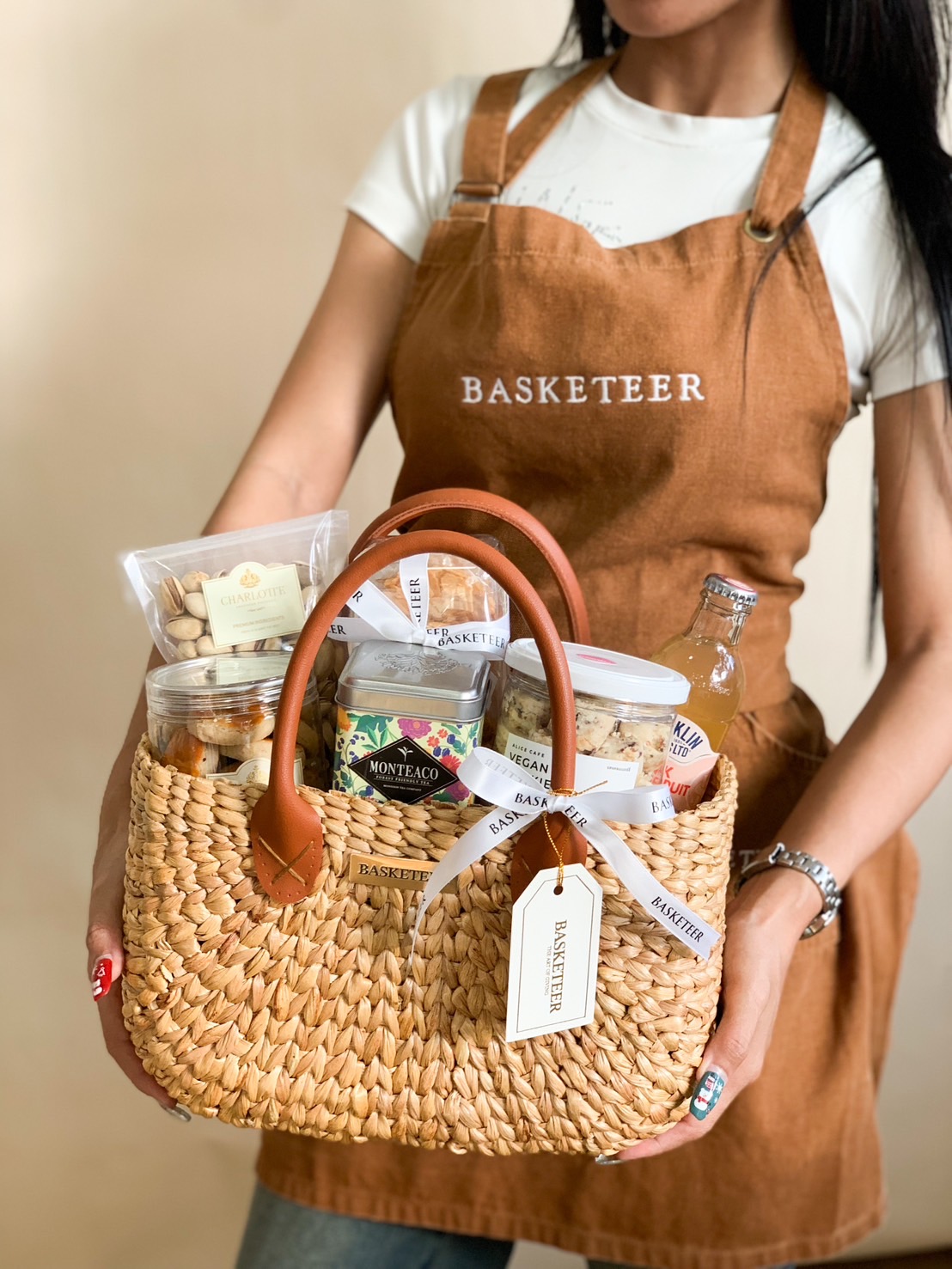 Summer Gift Basket A chic woven tote filled with cashew nut cookies, premium herbal tea, and refreshing beverages. This versatile basket makes for a delightful gift for any occasion.