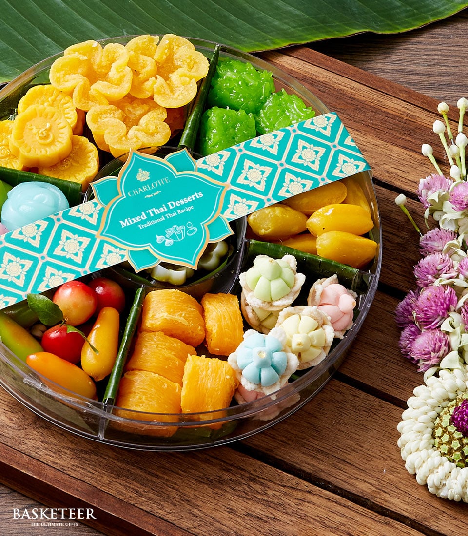 Thai Dessert Songkran Gift Indulge in a deluxe assortment of traditional Thai desserts, beautifully arranged in an elegant round gift box. Featuring Thong Yip, Foi Thong, Kanom Chan, Luk Chup, and more, this exquisite selection is ideal for festivals, special occasions, and premium gifting.
