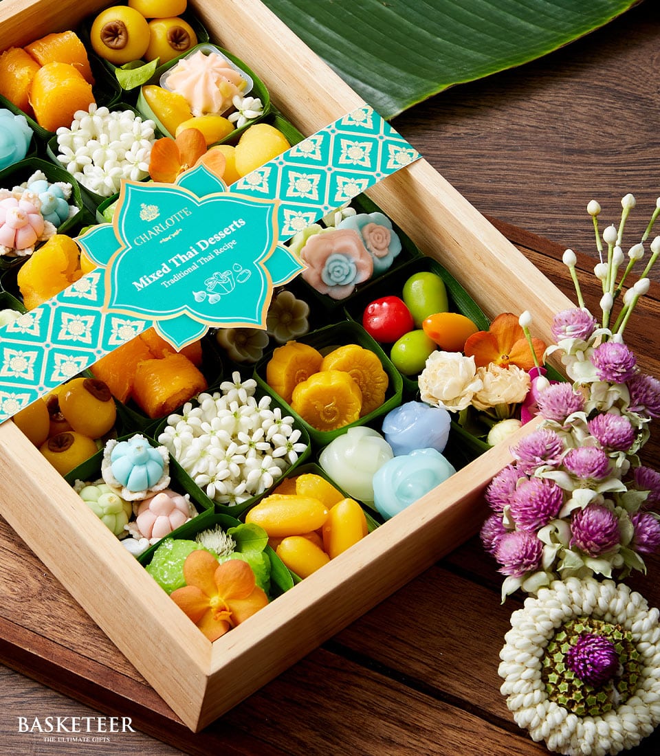Indulge in a luxurious Thai dessert gift box featuring Thong Yip, Luk Chup, and more. Beautifully packaged with a handwoven flower garland.
