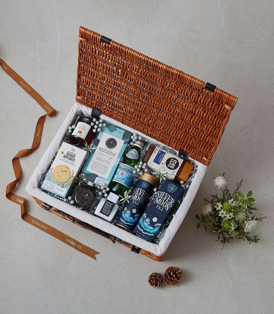 Luxury tea gift hamper featuring Silver Moon teas, oatcakes, honey, preserves, and sparkling San Pellegrino. Perfect for tea enthusiasts.