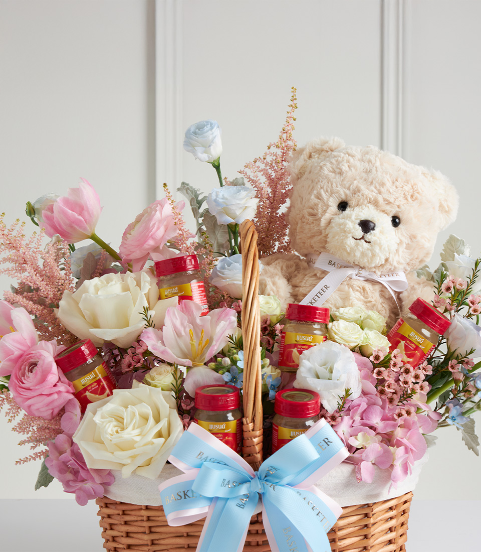 Teddy Bear & Bird’s Nest Flower Basket for Mother’s Day Surprise mum this Mother’s Day with a luxury gift basket featuring Brand’s Bird’s Nest, a cuddly teddy bear, and elegant pastel flowers. A heartfelt way to show love, care, and appreciation while wishing her wellness and joy.